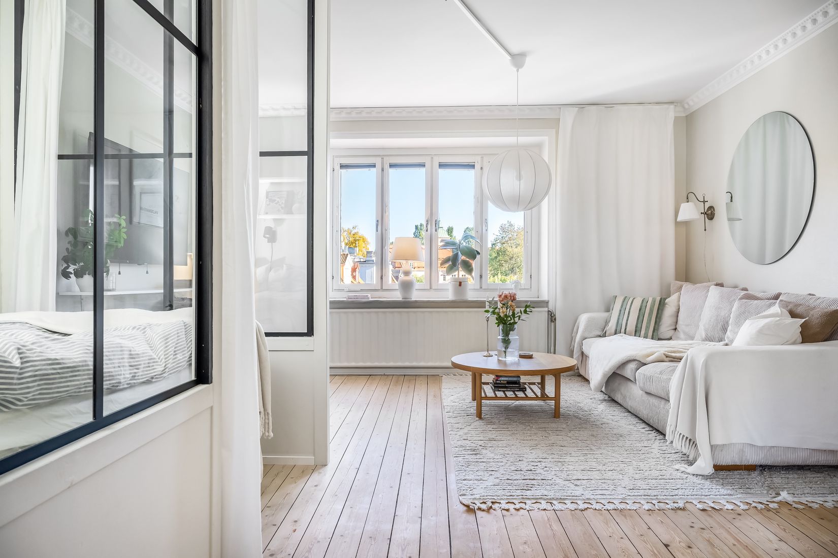 Vardagsrummet är ljust och lättmöblerat. Den smarta sovrumsdelen med väggar och spröjsade glaspartier i industriell stil ger rummet karaktär och skapar en mysig avskild sovplats. Lägenheten känns större än sina kvadrat.