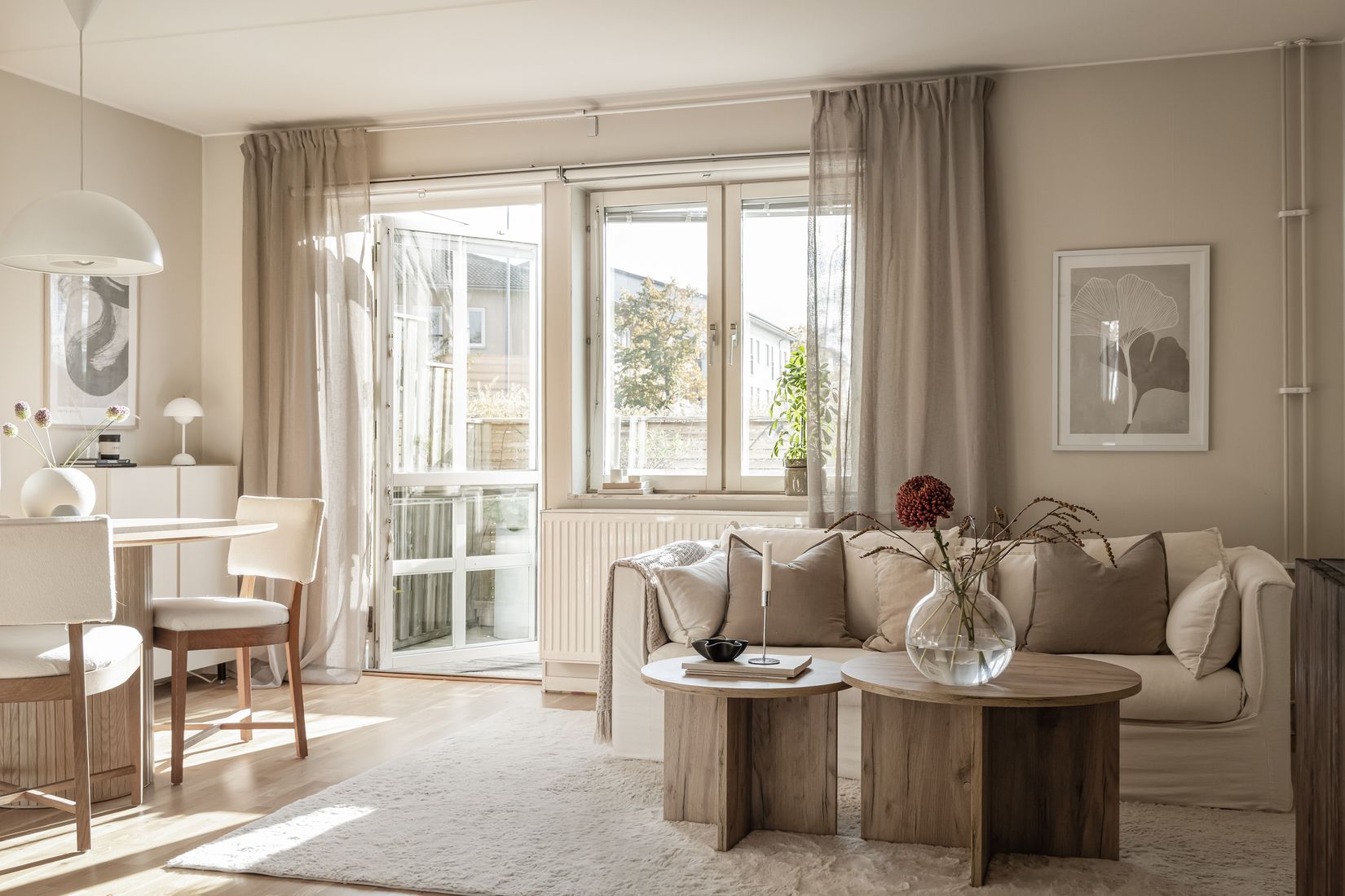 Lägenheten erbjuder en smart planlösning med modern interiör och ljusa materialval som skapar en härlig luftig känsla. Vardagsrummet har plats för både soffa och matbord, och sovdel. Köket är fräscht och funktionellt, utrustat med moderna vitvaror som gör matlagningen till ett nöje. Här finns också ett rymligt badrum med och gott om förvaringsmöjligheter. Bostadens härliga uteplats i söderläge blir en favoritplats under sommarhalvåret.
