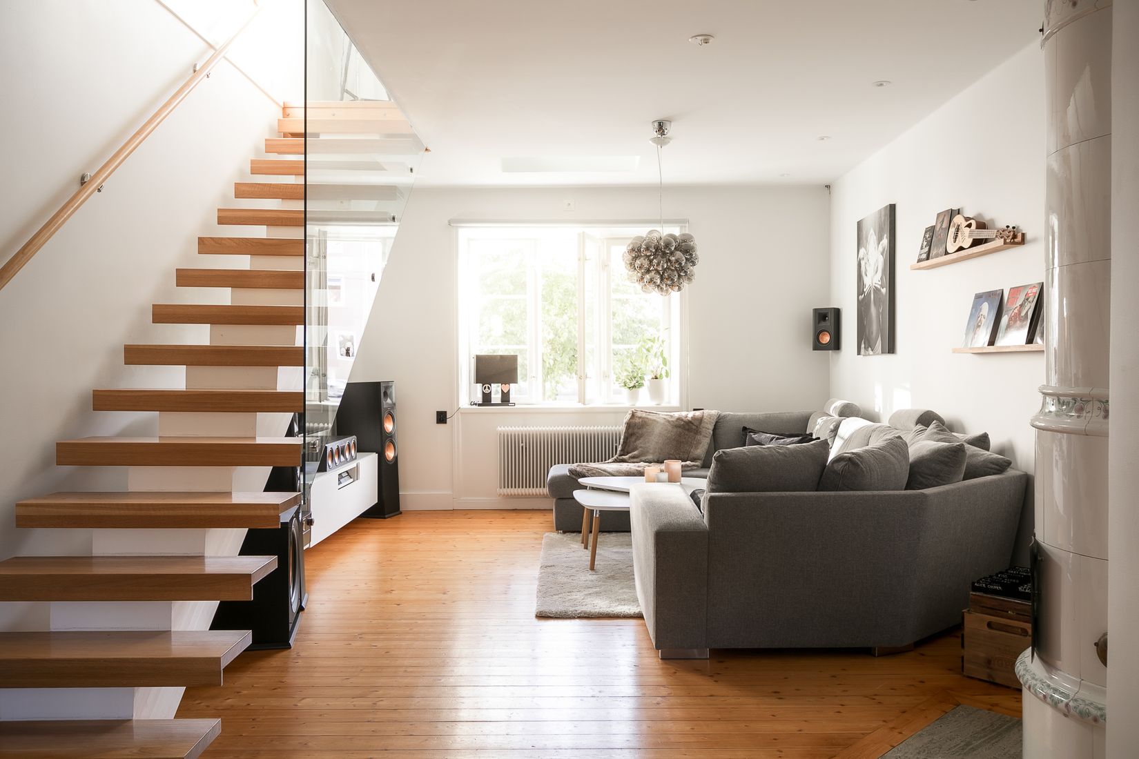 På entréplanet möts du av en välkomnande hall med gäst-wc och handfat. Köket ligger i öppen planlösning mot vardagsrummet, vilket skapar en härlig rymd och gör det till den perfekta platsen för sociala tillställningar. De stora fönsterpartierna fyller rummet med ljus och här finns även en vacker kakelugn (ej i bruk) som sätter extra karaktär och charm.