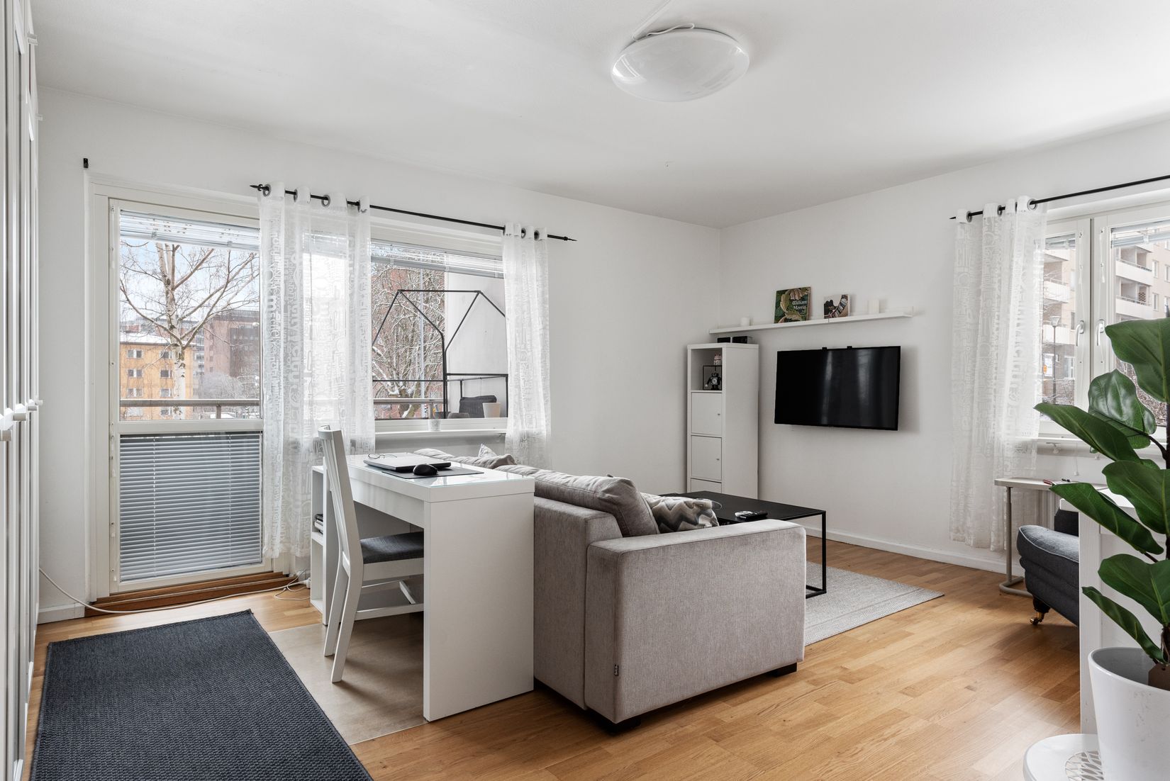 Går vi in i detalj på interiören så möts vi av fina golv som tillsammans med ljusmålade väggar utgör en perfekt grund. Det nyligen renoverade köket går i vitt, här finns en bra yta för matplats som rymmer små och stora sällskap. Vardagsrummet är rymligt med plats för både soffdel, skrivbord och matsalsdel om så önskas. I ena sidan av rummet finns en fönstervägg som ger ett härligt ljusinsläpp, här finns även utgången till den soliga balkongen. Intill hallen nås det rymliga sovrummet med plats för dubbelsäng, garderober samt extra förvaring om så behövs, sist men inte minst finns i lägenheten ett stort badrum, stilrent renoverat i stambytet.