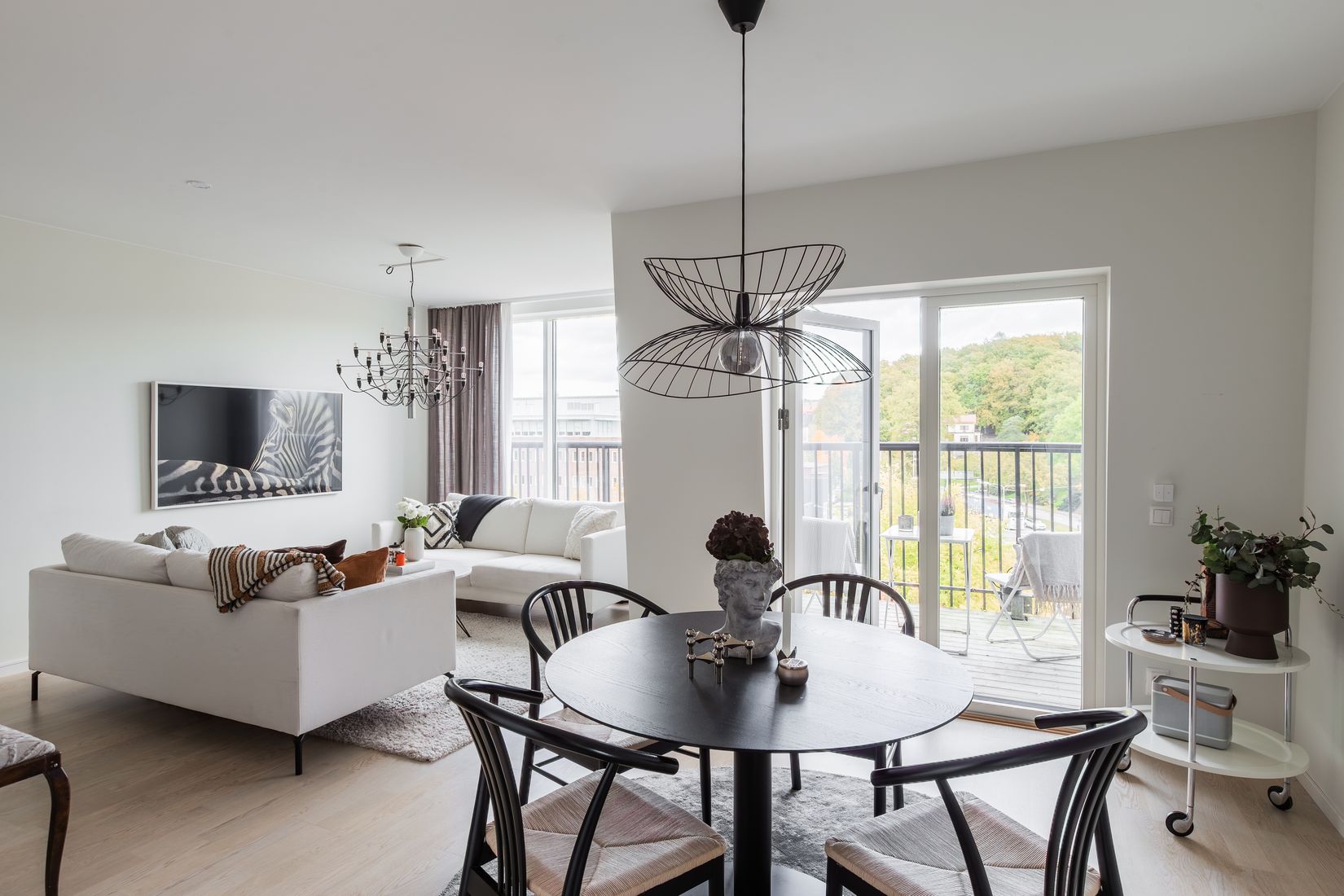På sjätte våningen med ljuset flödande in i denna fantastiska takvåning närmast lamslås man av utsikten över citykärnan och vidare upp mot Annelundsparken. I det lyckade projektet Brf Atelier återfinns detta sällsynta hem - optimalt planerad med vardagsrum och kök i en social planlösning, två sovrum och två fantastiska balkonger. Våningens atmosfär är starkt präglad av himmel, omfamnande grönska, rymd och kaskader av ljus. Här är känslan av riktigt stora rumsvolymer direkt påtaglig. Väl genomtänkt planlösning, fritt läge och generöst med takhöga fönsterpartier är förklaringen. Köket är funktionellt, rymligt med ett modernt formspråk och exklusiva tillval. Våningen har en praktisk tvättavdelning, elegant badrum samt en wc för gästerna, båda stilrent helkaklade. Materialen i våningen är genomgående exklusivt diskreta och designen är tidlös - onekligen ett hem utöver det vanliga.