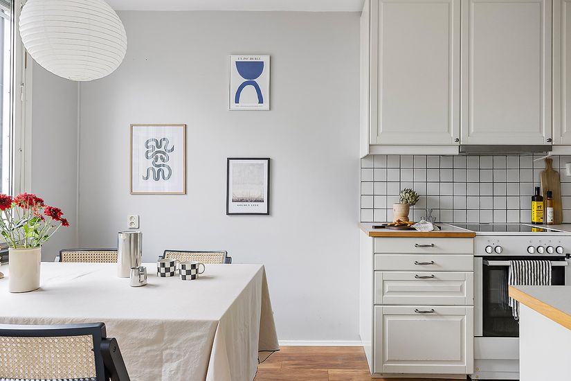 Det ljusa köket erbjuder gott om arbetsyta och förvaring, perfekt för den som gillar att laga mat! Här finns dessutom plats för matbord bredvid fönstret som släpper in rikligt med dagsljus.