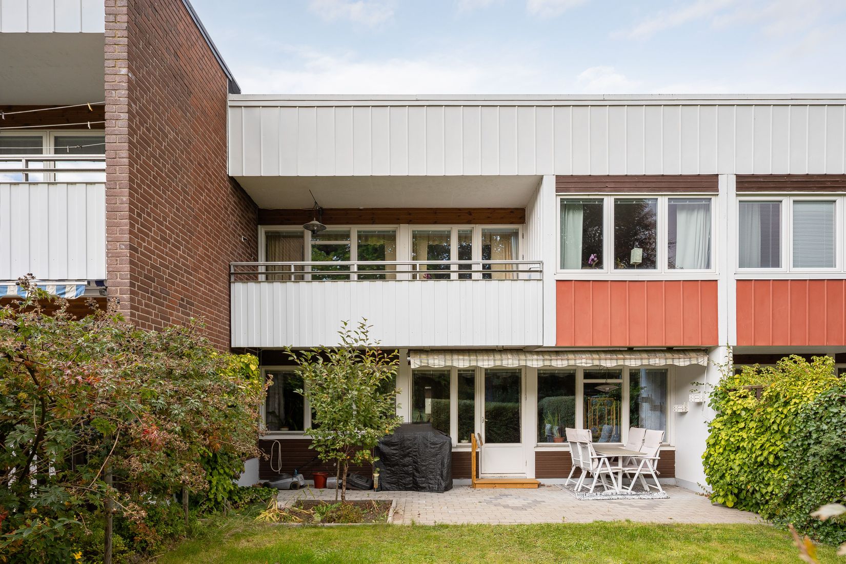 På framsidan möts du av en underhållsfri stenlagd uteplats och på baksidan väntar en inbjudande trädgård med både gräsyta och stenläggning, perfekt för umgänge och sommarens grillkvällar. Härifrån når man även de gemensamma ytorna mellan radhuslängorna. Här är det härliga välvårdade gräsytor tillsammans med lekplats och växtligheter.