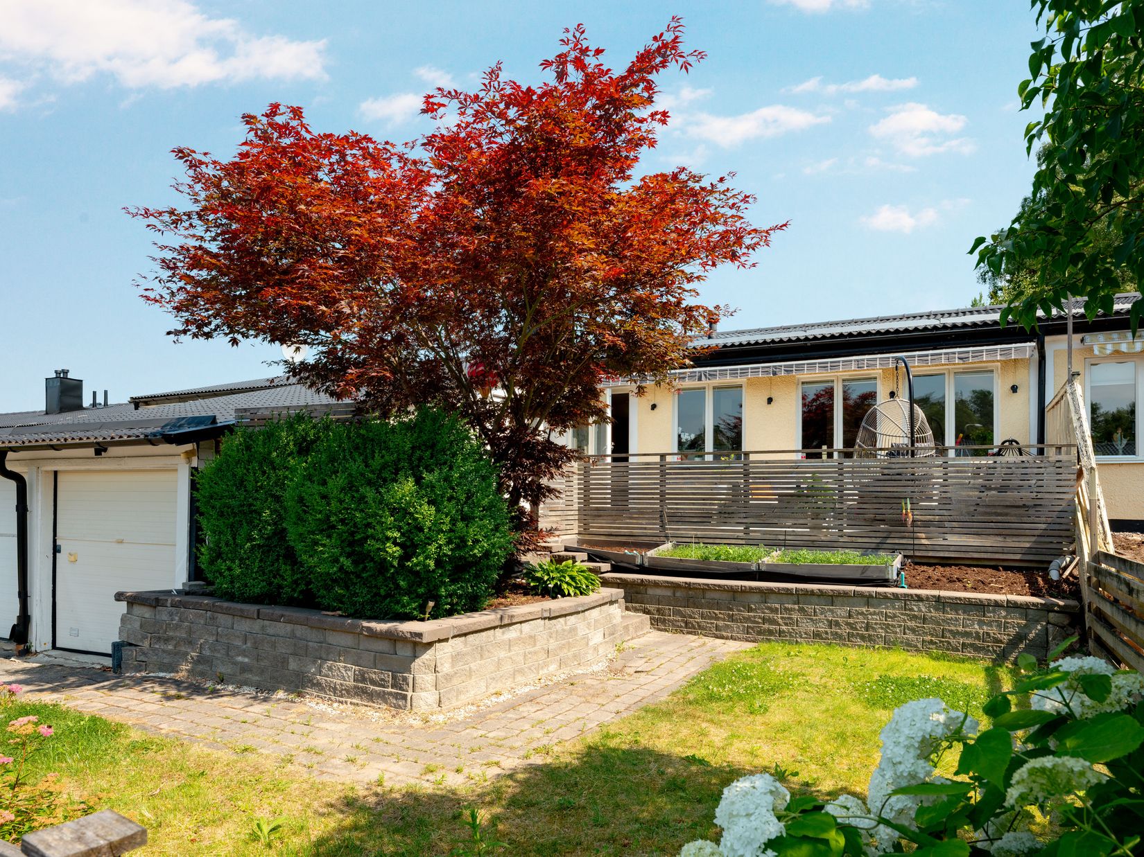 Stora fönster släpper in rikligt med naturligt ljus och ger er en direkt kontakt med uteplatsen. Här kan ni njuta av ert eget privata utomhusutrymme på den härliga uteplatsen – perfekt för grillkvällar, trädgårdsarbete eller bara avkoppling i solen. Två stora sovrum ger gott om plats för dubbelsängar och förvaring. Här kan ni skapa ert eget privata reträttområde där ni kan koppla av och njuta av en god natts sömn.