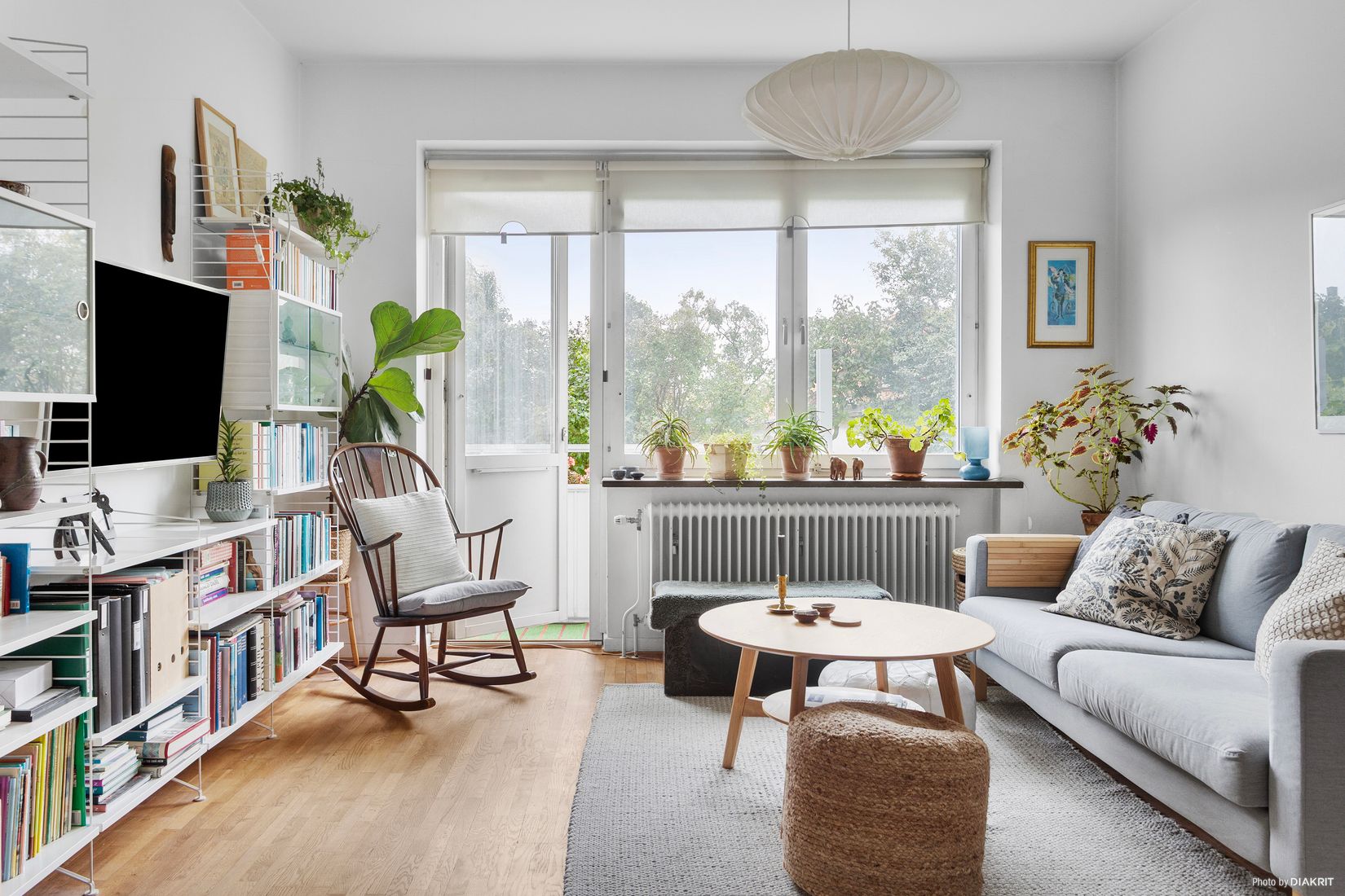 Det generösa allrummet erbjuder plats för både säng, soffgrupp och tv-möbel. Här har man smart skärmat av sovdelen för att skapa en naturlig rumsindelning. Från allrummet nås den soliga balkongen i söderläge, en perfekt plats att njuta av morgonkaffet eller sommarkvällen.
