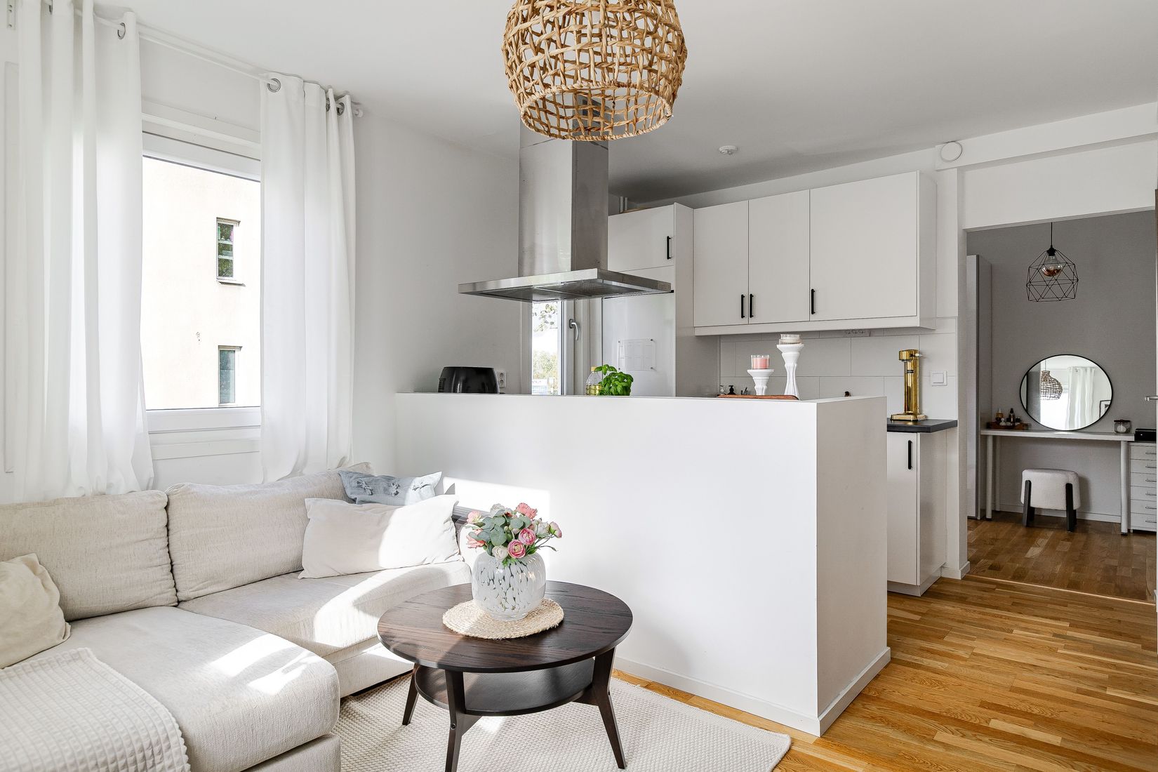 När du stiger in i bostaden möts du av sovdelen, som är smart placerad längst in i hallen och diskret avskild från övriga ytor.