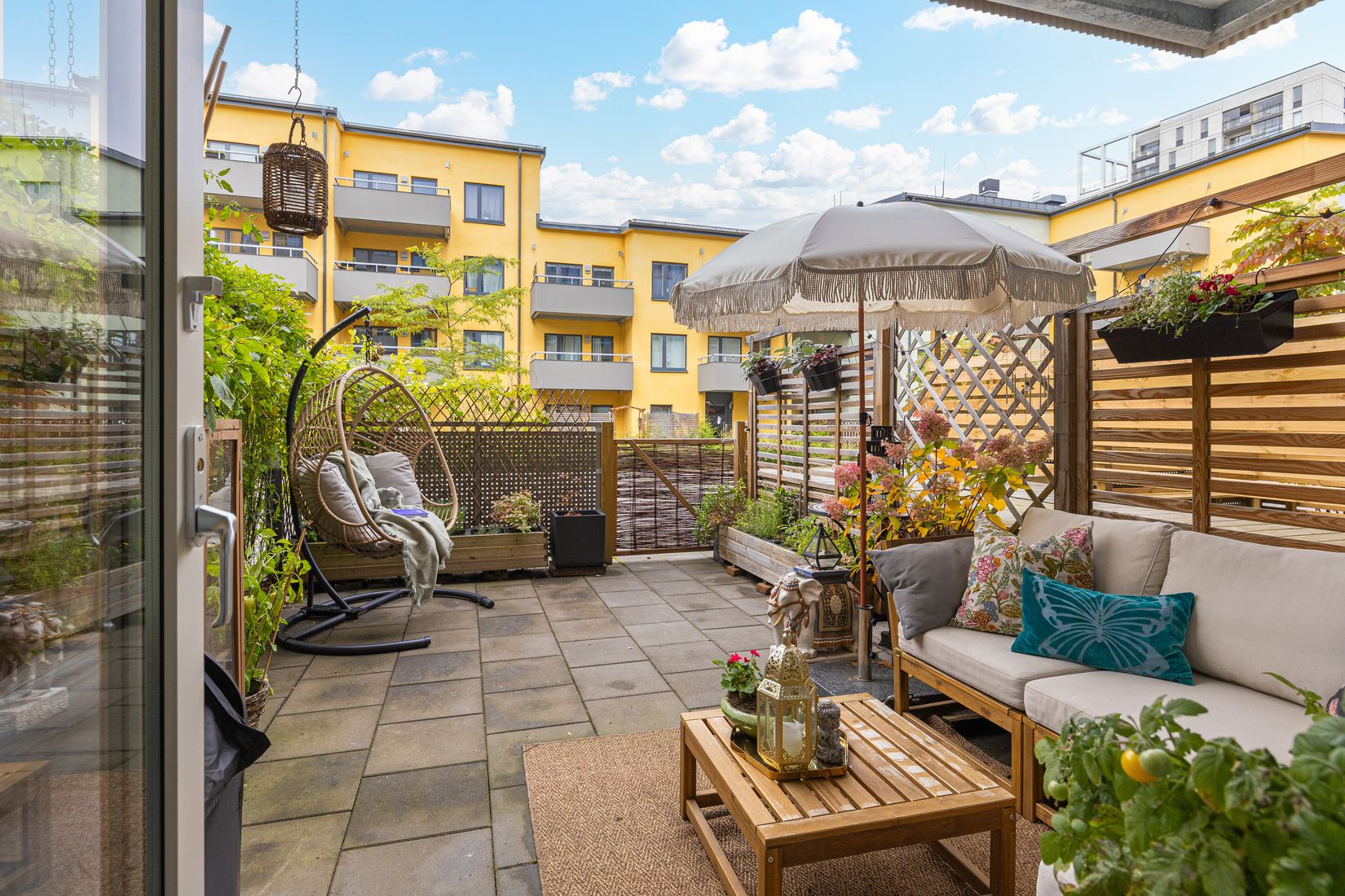 De stora fönsterpartierna släpper in generöst med ljus och tillsammans med de designfulla ytskikten och ekparketten skapas en hemtrevlig och trivsam atmosfär. Köket från Vedum med vit inredning och vitvaror från Electrolux bjuder in till matlagning och umgänge. Det helkaklade badrummet har golvvärme och kombinerad tvättmaskin/torktumlare. Sovrummet är rogivande med gott om förvaring, och vardagsrummet ligger i fin anslutning till köket, perfekt för både vardag och fest. Utöver det erbjuder bostaden en lummig och privat innergård med plats för umgänge och lek.