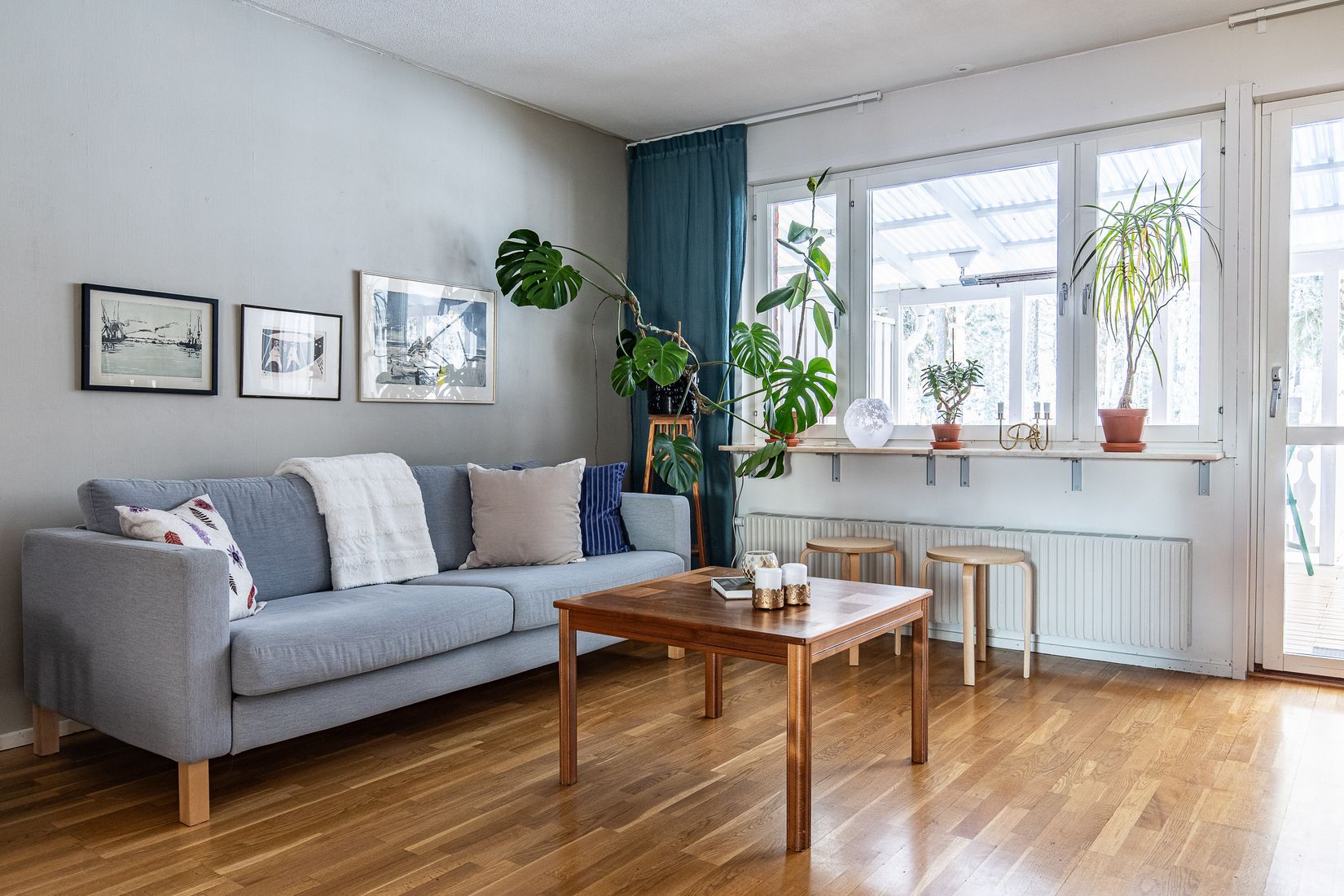 När du kliver in på nedre plan möts du av en välkomnande hall som leder vidare till ett mysigt sovrum, ett badrum med dusch, ett kontor som även kan fungera gästrum, ett hobbyrum eller extra sovrum samt ett stort förråd med gott om plats för förvaring. En stilren trappa tar dig upp till övre plan där ett luftigt vardagsrum öppnar upp mot den härliga altanen. Här finns också två rogivande sovrum, ett ljust och välutrustat kök med moderna vita skåpluckor och en exklusiv stenskiva från Granit och Form i Ås, samt ett badrum med badkar. Altanen är väl tilltagen och har plats för både matgrupp och loungehörna – perfekt för sommarens middagar och kvällar med vänner. Här finns även ett praktiskt utvändigt förråd, och från altanen når du din egen täppa – en grön oas med potential för både odling och lek.