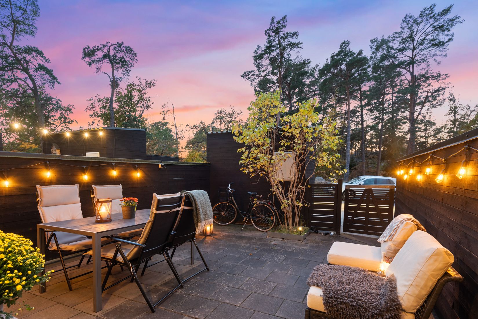 - Inramad uteplats i väst med mycket sol från förmiddag till kväll och lä från vind