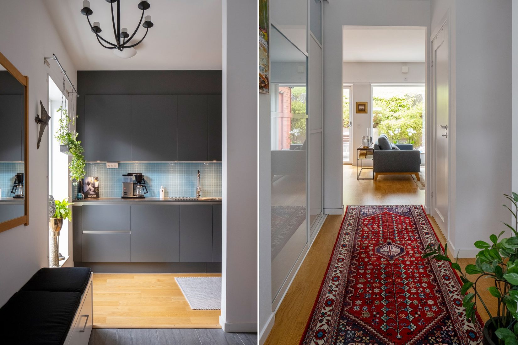 Detaljer som den vackra ektrappan som förbinder våningsplanen, genomgående smakfulla färgval och flera praktiska förråd ger ett hem där varje kvadratmeter är väl utnyttjad. Utanför möts du av en stensatt entré med plats för både bil i carport och en vacker dekorativ växtinstallation som ger ett välkomnande intryck.