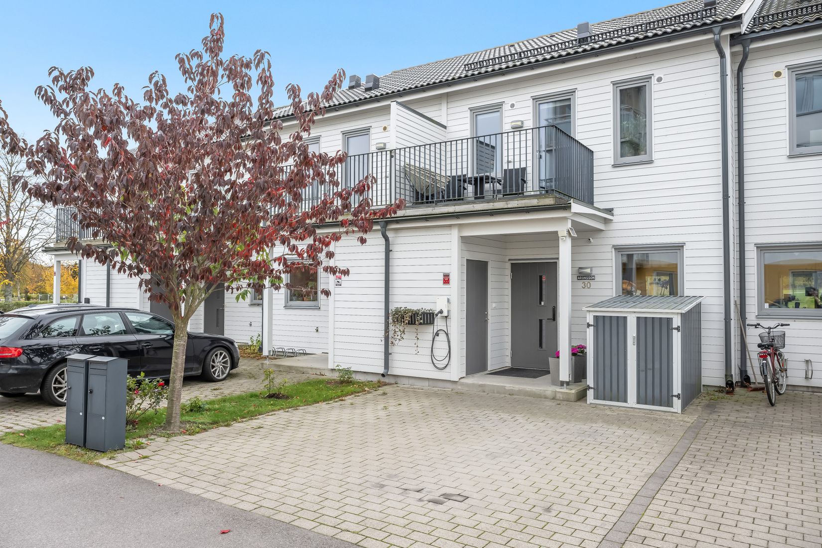 På en lugn återvändsgata, omgiven av grönska och trivsam bebyggelse, ligger detta välplanerade tvåplansradhus som bjuder på både rymd, ljus och modern komfort. Här bor du enkelt, bekvämt och bekymmersfritt - med två egna parkeringsplatser, lättskött mindre gräsyta och en härlig uteplats som inbjuder till grillkvällar, lek och avkoppling i solen. Balkongen på framsidan och altandäcket på baksidan gör det möjligt att följa solen från morgon till kväll.
