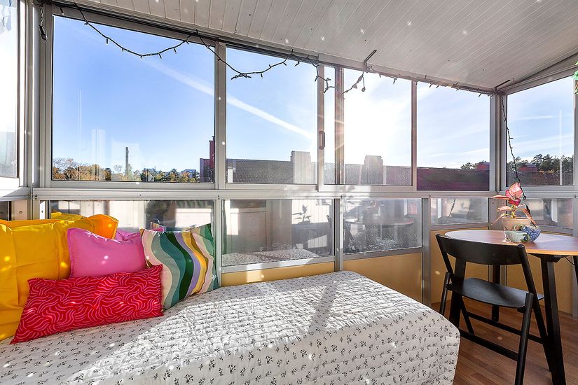 Köket är rymligt och har utgång till en stor inglasad balkong - en fin plats att njuta av årets alla säsonger. I vardagsrummet finns dessutom en fransk balkong som bidrar till den ljusa och luftiga känslan.