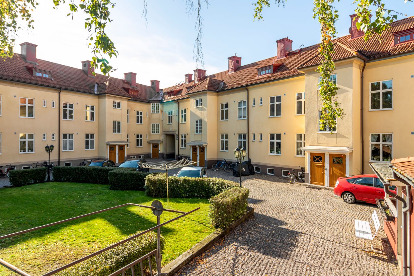I entréhallen möts du av smart förvaringsyta som vilar på det rustika trägolvet och med utsikt mot innergården samt spotlights från taket. Det rustika trägolvet ligger i hela lägenheten. Skjutdörrar in mot köket med mörka ekskåpluckor, integrerad diskmaskin och rostfria vitvaror samt matplats. Nyrenoverat och stilrent helkaklat badrum med klinkergolv och duschplats, allt nytt från 2025. Rymligt vardagsrum med generösa fönsterpartier med plats för soffgrupp, matgrupp och trevligt sällskap! Vidare in i lägenheten finner du sovrum 1 som är rymligt med garderobsvägg och stora fina fönster. Sovrum 2 används idag som walk in closet och är målat i ljusa kulörer. Det stora fönstret ger ett trevligt ljusinsläpp. Vidare in så finner vi ett genomgångsrum med fönster ut mot den trevliga innergården, perfekt för hemmakontoret. Skjutdörrarna leder vidare in till det supercharmiga sovrum 3 med sin rustika fondvägg där trä och tegel möts, här finns även ett litet fönster som förstärker charmen. Praktisk wc/tvättstuga i anslutning till hallen som renoverades 2025. Till lägenheten hör det till 2 stycken vindsförråd och tre källarförråd.