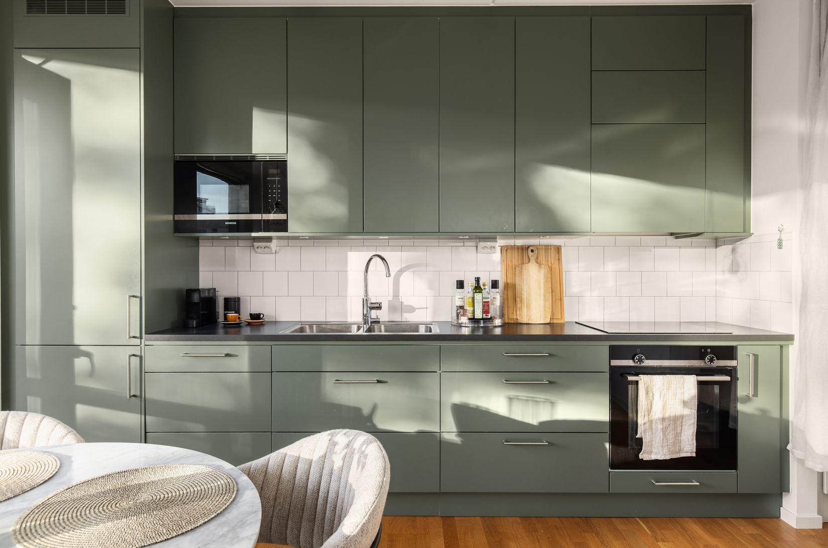 Bostaden präglas av en öppen och inbjudande planlösning där kök och vardagsrum samspelar i en trivsam social yta. Det stilrena köket erbjuder goda arbetsytor, full maskinell utrustning och plats för matbord, idealiskt för såväl vardag som helg. De stora fönsterpartierna ger ett rikligt ljusinsläpp och skapar en härlig rymd i hela lägenheten.