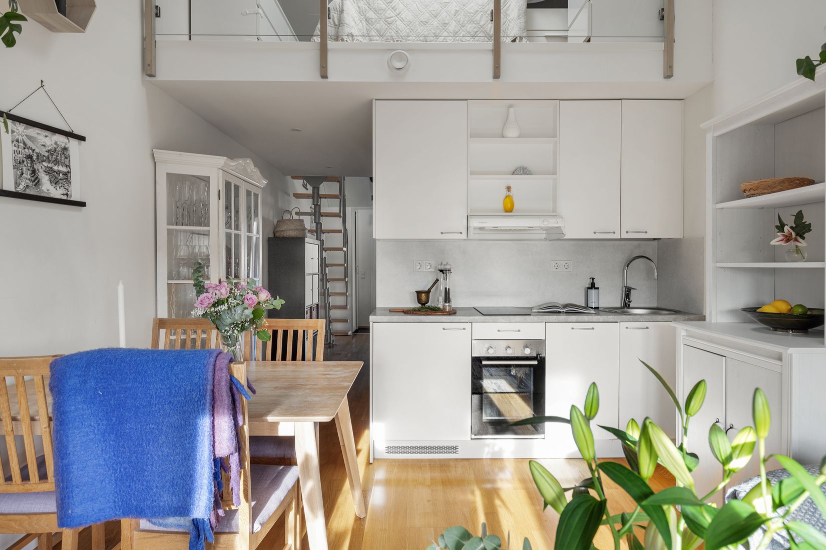 En elegant trappa leder upp till den mysiga loftvåningen, där sovrummet ligger avskilt men ändå öppet mot bostaden. Här skapar snedtaket och takfönstret en lugn och behaglig atmosfär, perfekt för vila och avkoppling.