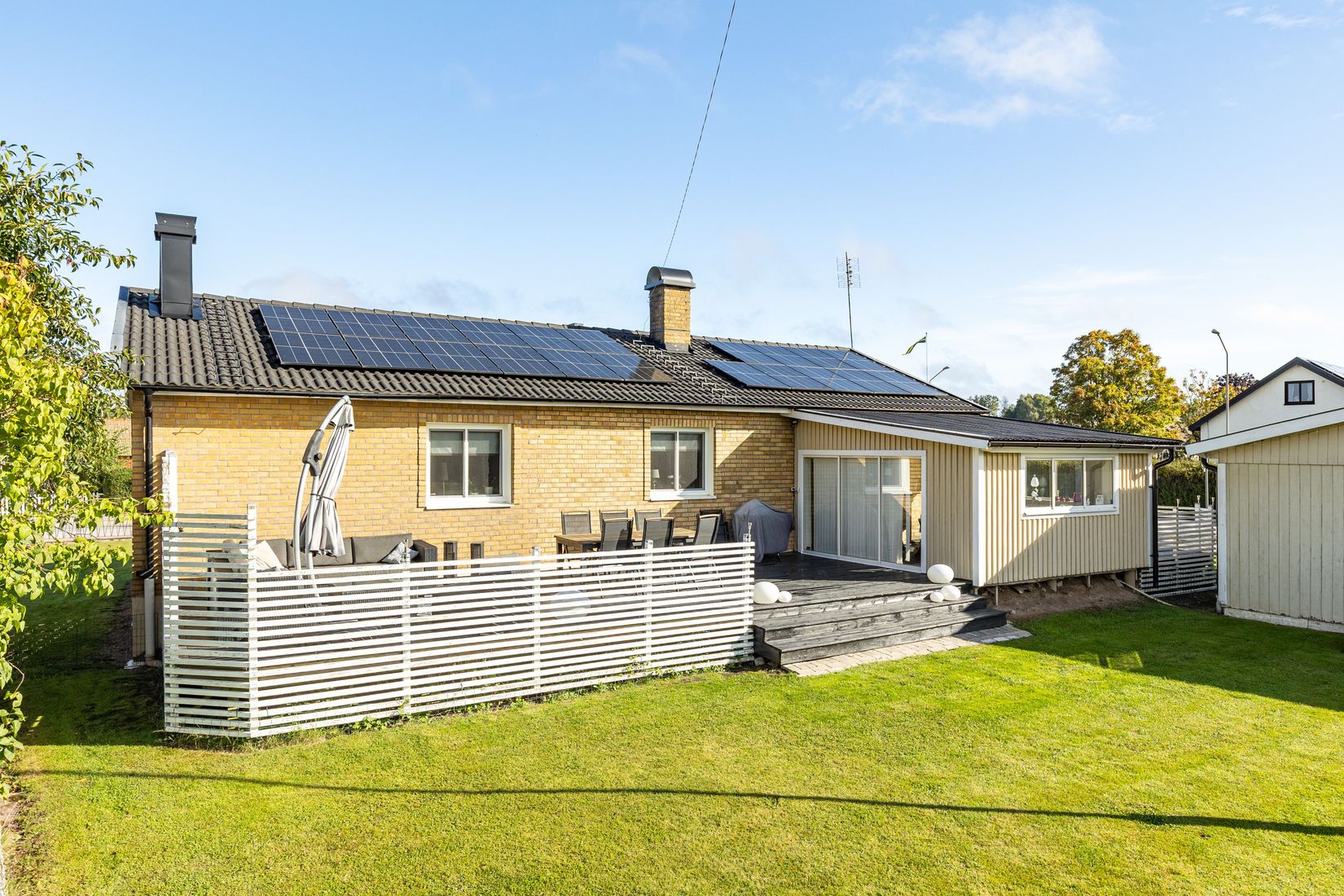 Fastigheten har en insynsskyddad baksida med trädgård i soligt söderläge – idealiskt för uteplats eller odling. Tomten är lättskött och ger plats för både lek och avkoppling. Huset har tegelfasad vilket innebär ett ytskikt med lågt underhållsbehov.