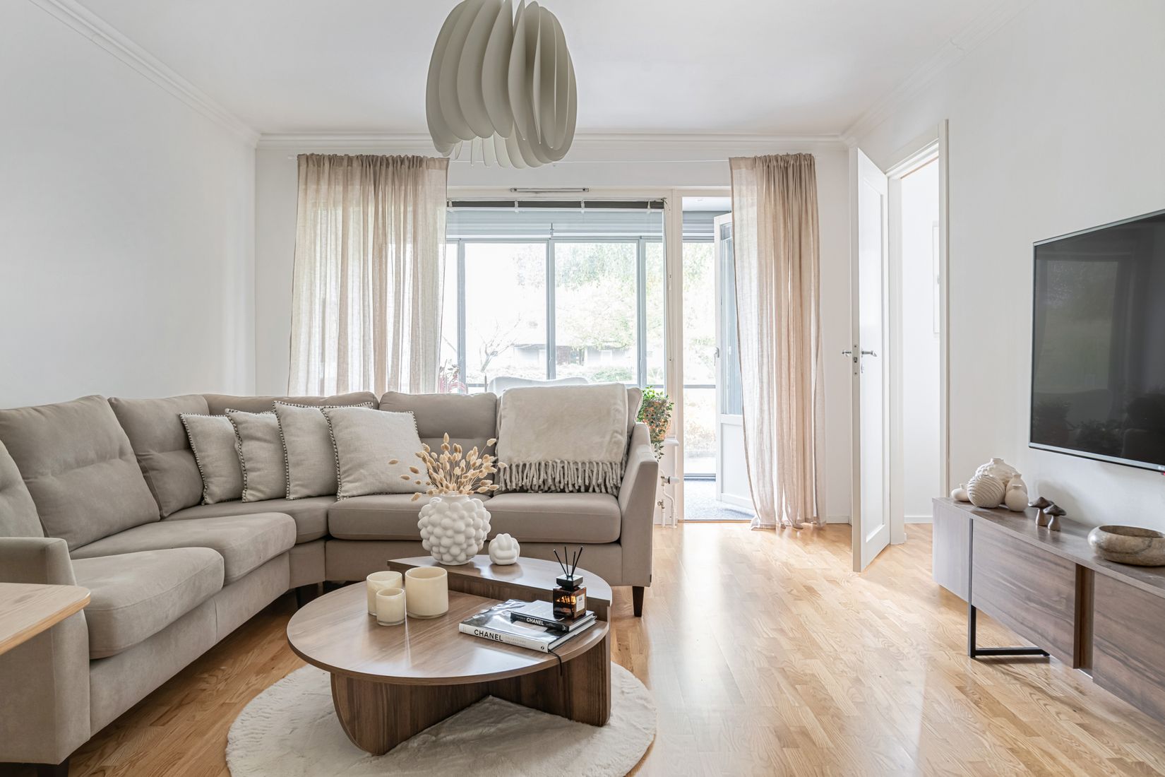 Hallen är väl tilltagen och erbjuder goda förvaringsmöjligheter. Vardagsrummet är luftigt med ett fint ljusinsläpp och har utgång till den inglasade uteplatsen i västerläge där du sitter ostört mot den parkliknande innergården. Tack vare inglasningen kan uteplatsen nyttjas under stora delar av året och blir en trivsam förlängning av vardagsrummet.