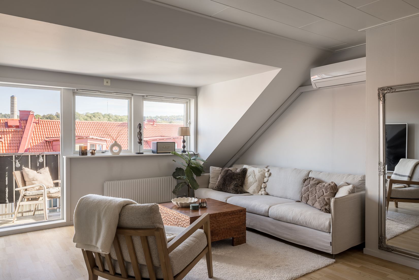 Redan när du kliver in möts du av ett harmoniskt lugn och en smart planlösning där varje kvadratmeter fyller sin funktion. Vardagsrummet är rymligt men ombonat, med ett generöst fönsterparti som släpper in ljuset över takåsarna – och en dörr som leder ut till en egen balkong i härligt nordostläge. Här blir det snabbt favoritplatsen för morgonkaffet, kvällsboken eller middagen med utsikt över hustaken och en avskild känsla högt ovanför marken.