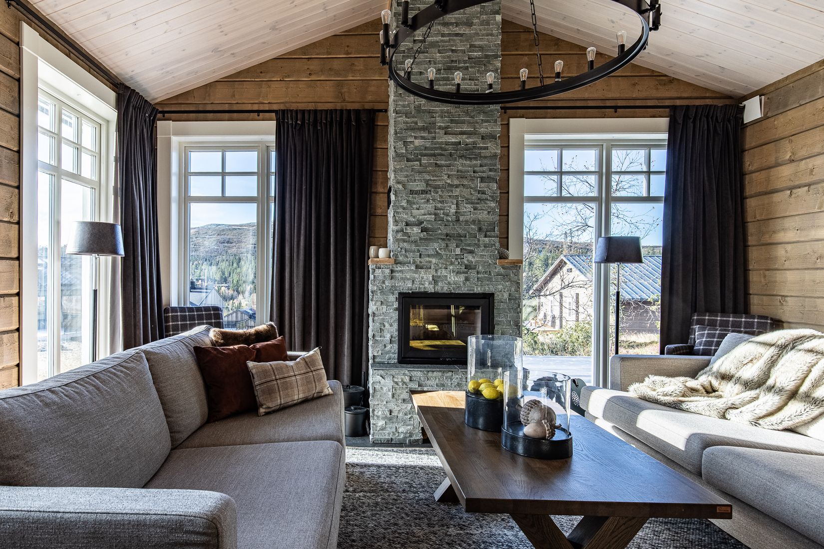 Vardagsrummet bjuder på generös takhöjd som skapar en känsla av rymd och närvaro. De stora fönstren släpper in ljuset och binder samman rummet med fjällens skiftande natur. Här finns plats både för stillhet och samvaro, och braskaminen blir en självklar mittpunkt under årets kallare dagar.
