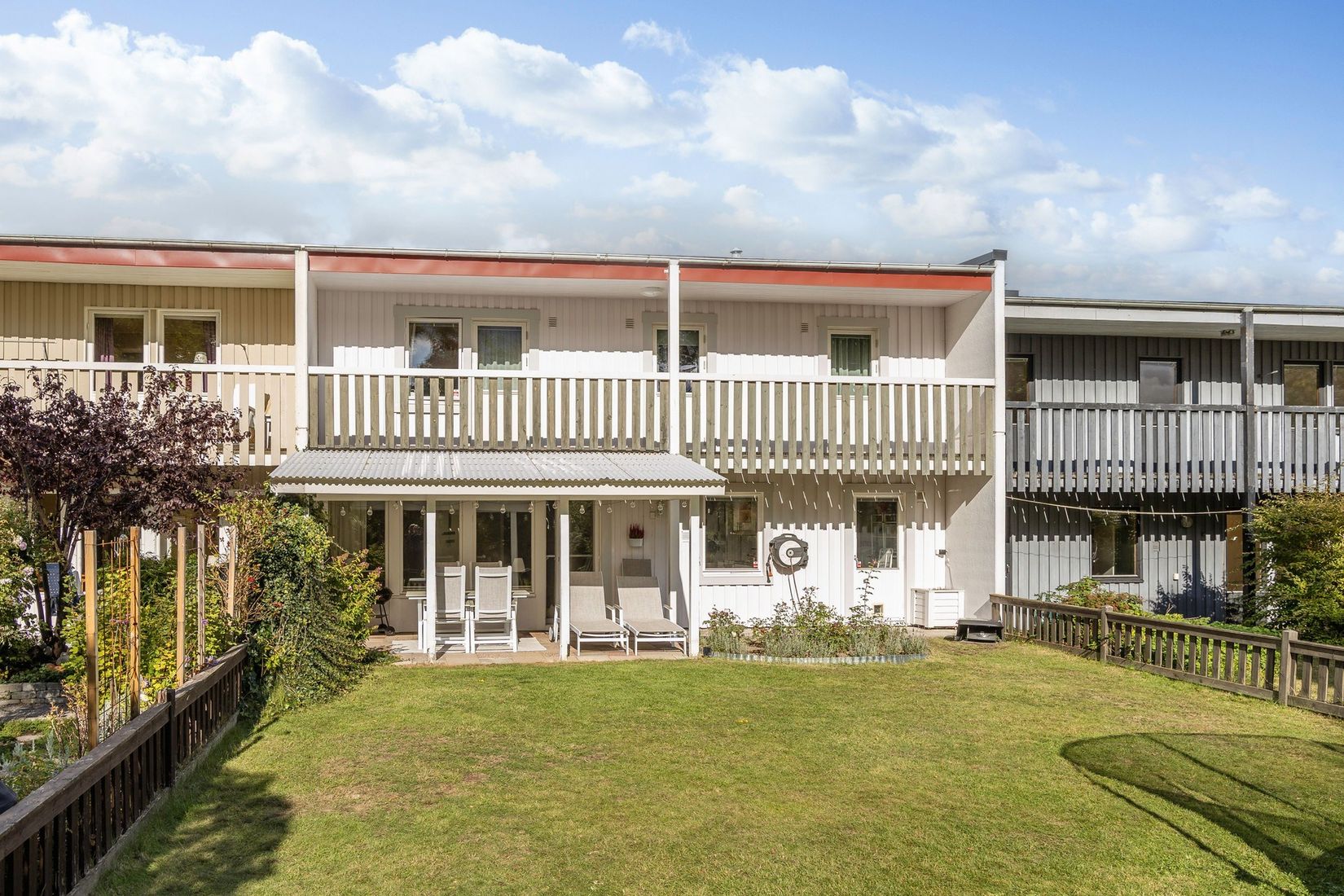 Härlig baksida med både uteplats och balkong.