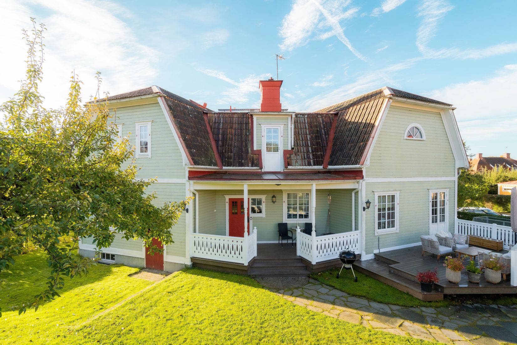 Exteriört bär huset tydliga drag från tidigt 1900-tal. Det brutna, valmade taket och fasadens symmetriska uttryck ger huset sin klassiska karaktär. Den gröna fasaden samsas smakfullt med vita snickerier och diskreta röda detaljer, en färgkombination som skapar rätt känsla redan vid första intrycket.
