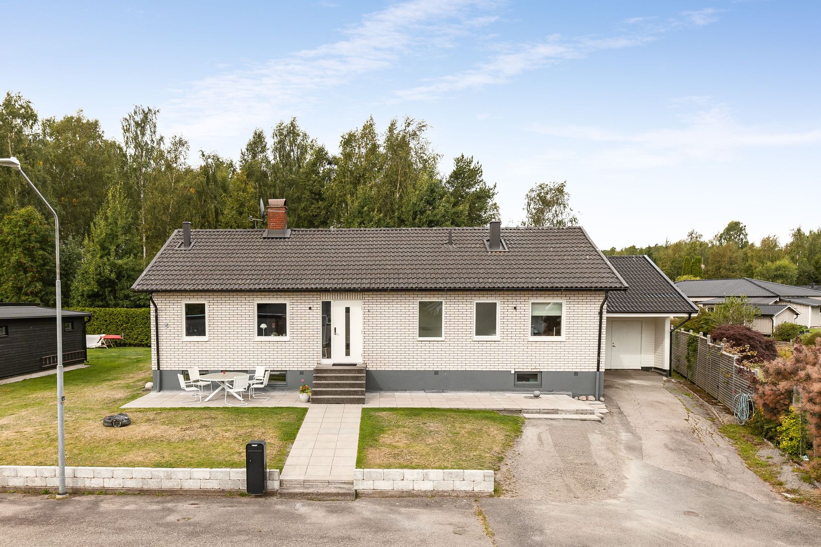 På framsidan möts du av en asfalterad garageuppfart och ett vidbyggt uppvärmt garage med praktisk vindsförvaring. Uppvärmning sker kostnadseffektivt med den nya luft/vattenvärmepumpen.