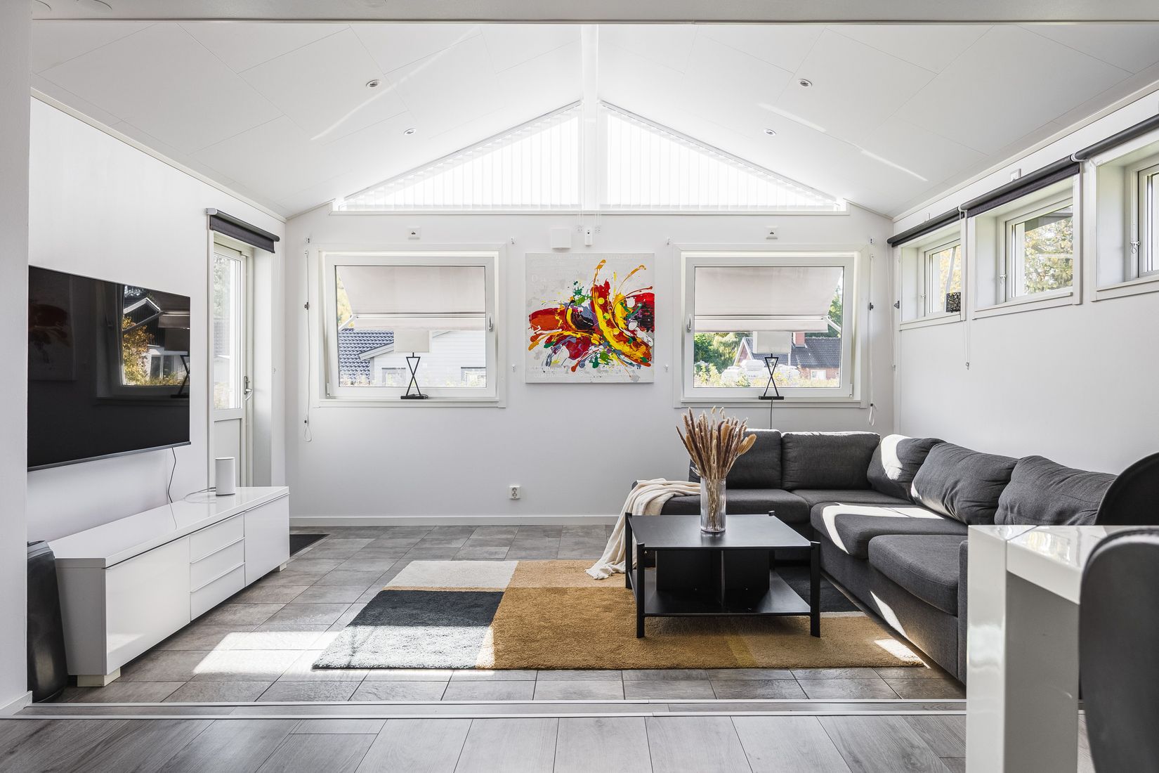 Det utbyggda vardagsrummet bjuder på öppet till nock och stora fönsterpartier som låter ljuset flöda fritt. Här finns gott om plats för både soffgrupp och matsal, och den stilfulla braskaminen skapar stämning under årets alla årstider. Från vardagsrummet kliver du rakt ut på altanen och vidare till trädgården – en självklar scen för sommarens middagar, lek och avkoppling.