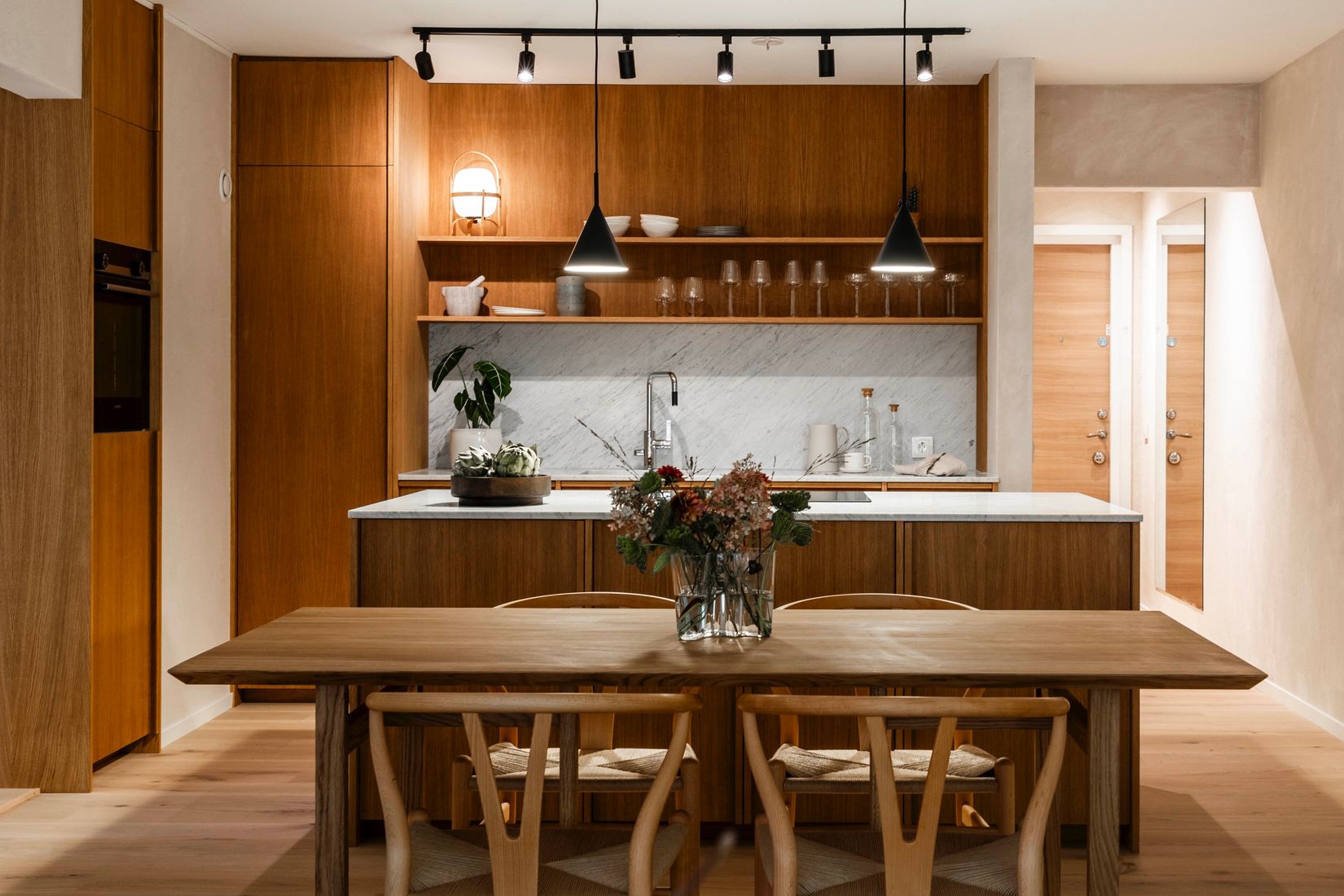 Renoveringen har utförts med möbelprecision – från platsbyggda snickerier till specialbyggda lösningar som maximerar varje kvadratmeter. Genomgående exklusiva materialval såsom carraramarmor, ek och detaljer från välrenommerade leverantörer som Bricmate och Tapwell sätter en sofistikerad ton i varje rum. Planlösningen är enastående välplanerad med tre ordentliga sovrum, ett socialt kök och vardagsrum i öppen planlösning samt smakfullt utformade förvaringslösningar som smälter sömlöst in i interiören. Ljuset flödar genom bostaden och framhäver den noggrant avvägda färg- och materialpaletten.