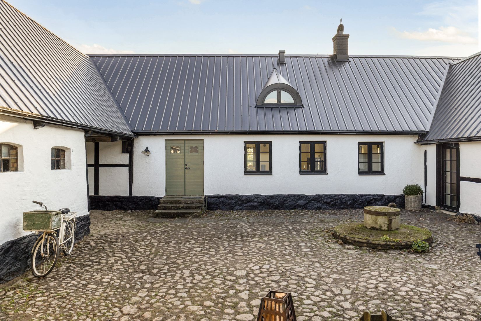 Den kullerstensbelagda innergården skapar en historisk mijlö. Här omfamnas du av de fyra längorna – bostadshuset, det gamla stallet med sin vackra äldre del, garaget, ateljén och ladan som i dag är förvandlad till en inbjudande festlokal med högt i tak och ett magnifikt fönsterparti mot det öppna landskapet. En plats att samla familj och vänner, året runt.