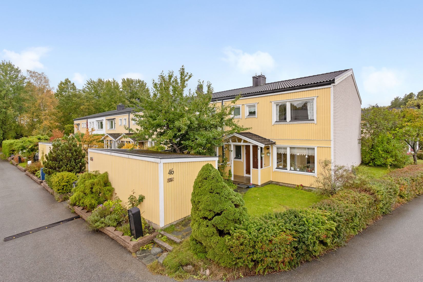 Utomhus väntar en trivsam och lättskött trädgårdstomt i sydvästläge som omgärdar huset tack vare det fina gavelläget. Här kan familjen njuta av soliga dagar, lek och avkoppling. På framsidan finns dessutom ett praktiskt förråd med gott om plats för cyklar, redskap och säsongsförvaring.