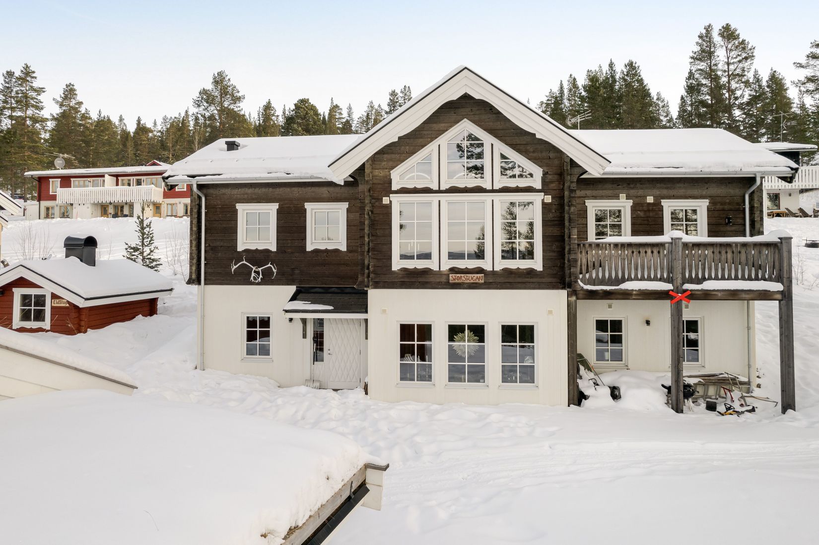 Här möts du av ett drömhus på toppläge i Björnrikes övre del, signerat Forsgrens timmerhus. Storstugan med öppen spis inbjuder till trevligt umgänge på kvällarna. Det stora köket och matplatsen kan samla många kring långbordet. Från kök och storstuga har du magisk utsikt mot Sonfjällets ikoniska siluett ca 3 mil bort.