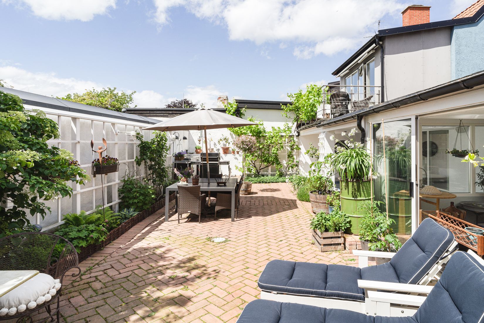 Den insynsskyddade trädgården är perfekt vänd mot sydväst och bjuder på bästa solläge samtidigt som den ramas in av växtbeklädda murar, orangeriet och en uppvärmd pool på 3x6 meter. Trädgården är lättskött med stenläggningar och ger möjlighet till utekök, matplats samt loungemöbler. De lättskötta planteringarna fylls av vinrankor, äppelträd, rosor, lavendel, hortensia och buxbom, vilket ger vacker lummighet och leder tankarna till Medelhavet.