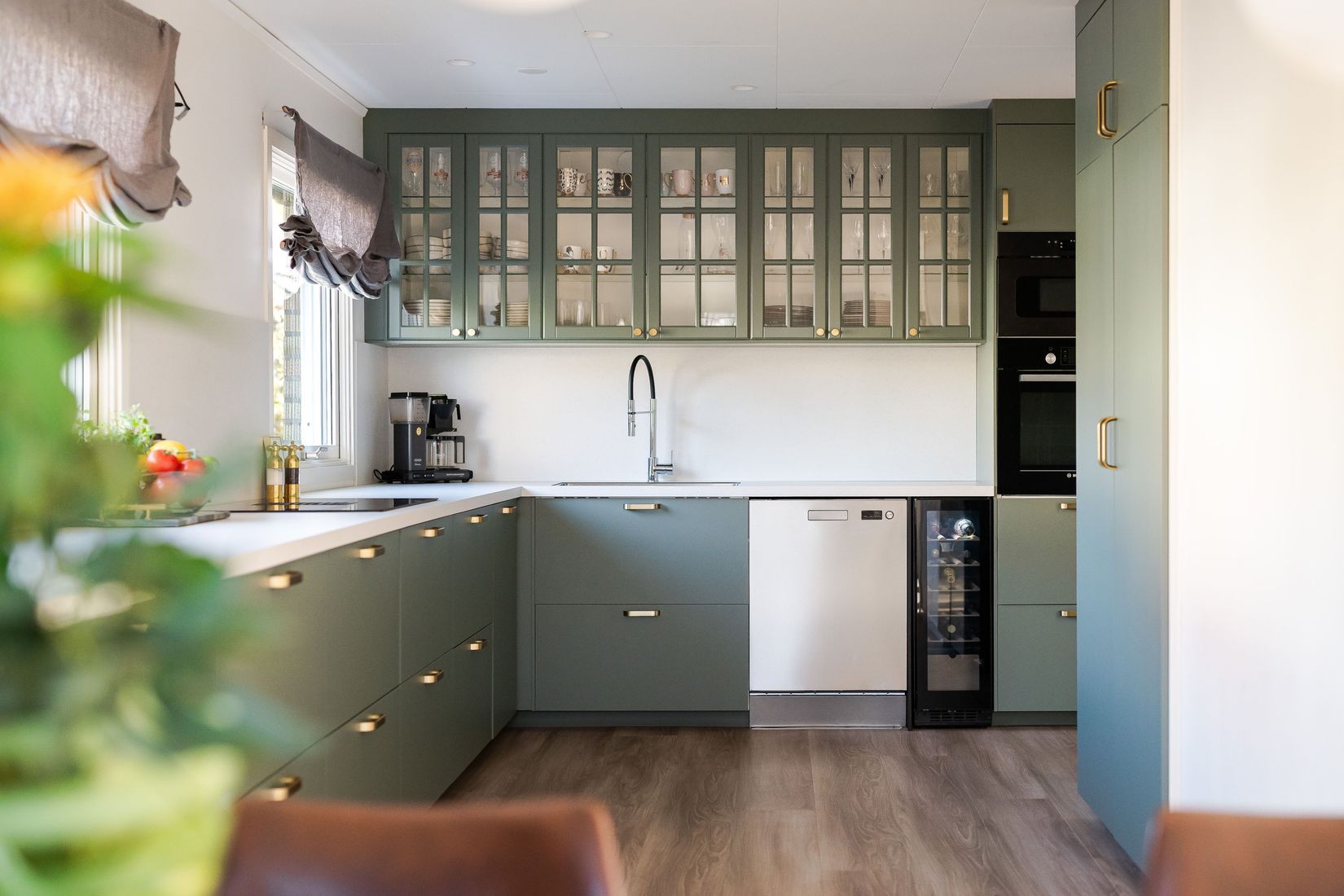 Köket, som renoverades 2025, är hemmets naturliga mittpunkt, smakfullt utformat i gröna toner med ljus bänkskiva och vitrinskåp med belysning. Här finns gott om förvaring, stora arbetsytor och en stilren design som kombinerar funktion och elegans på bästa sätt. Intill köket ligger matplatsen och vardagsrummet, där stora fönsterpartier ger ett härligt ljusinsläpp och skapar en trivsam atmosfär.