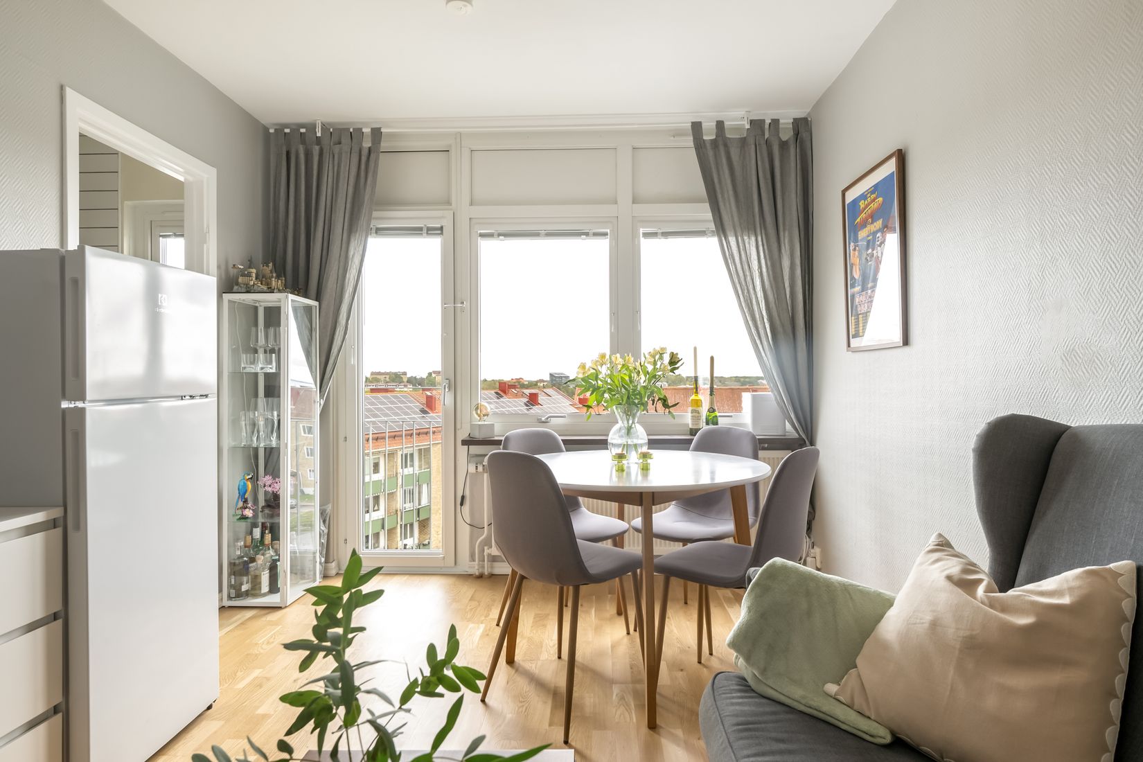 Allrummet är rymligt och lättmöblerat, med stora fönsterpartier i söderläge som ger ett generöst ljusinsläpp. Här finns gott om plats för både soffa, matbord och eventuell sovalkov. Den franska balkongen blir pricken över i och bjuder på en fantastisk vy över staden.