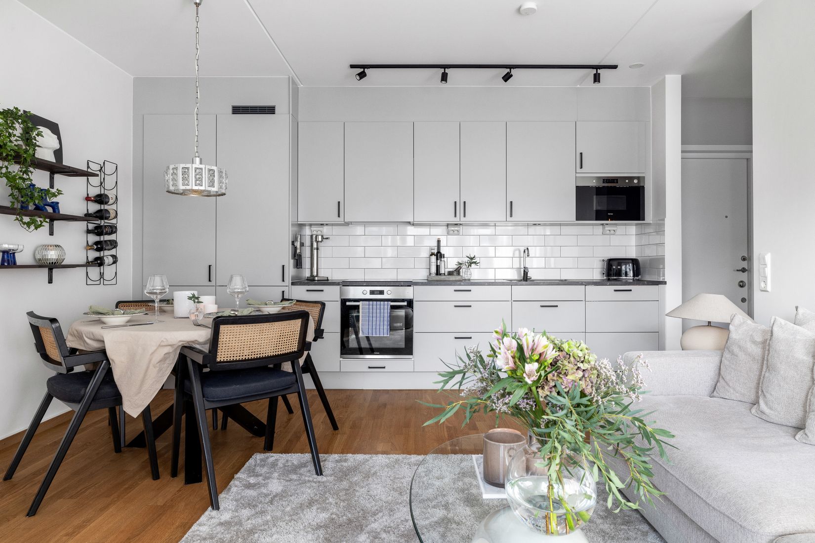 Bostaden präglas av en öppen planlösning mellan kök och vardagsrum som skapar en inbjudande och social yta för både vardag och umgänge. Från vardagsrummet nås den inglasade balkongen som förlänger säsongerna och blir ett extra rum under årets varmare månader.