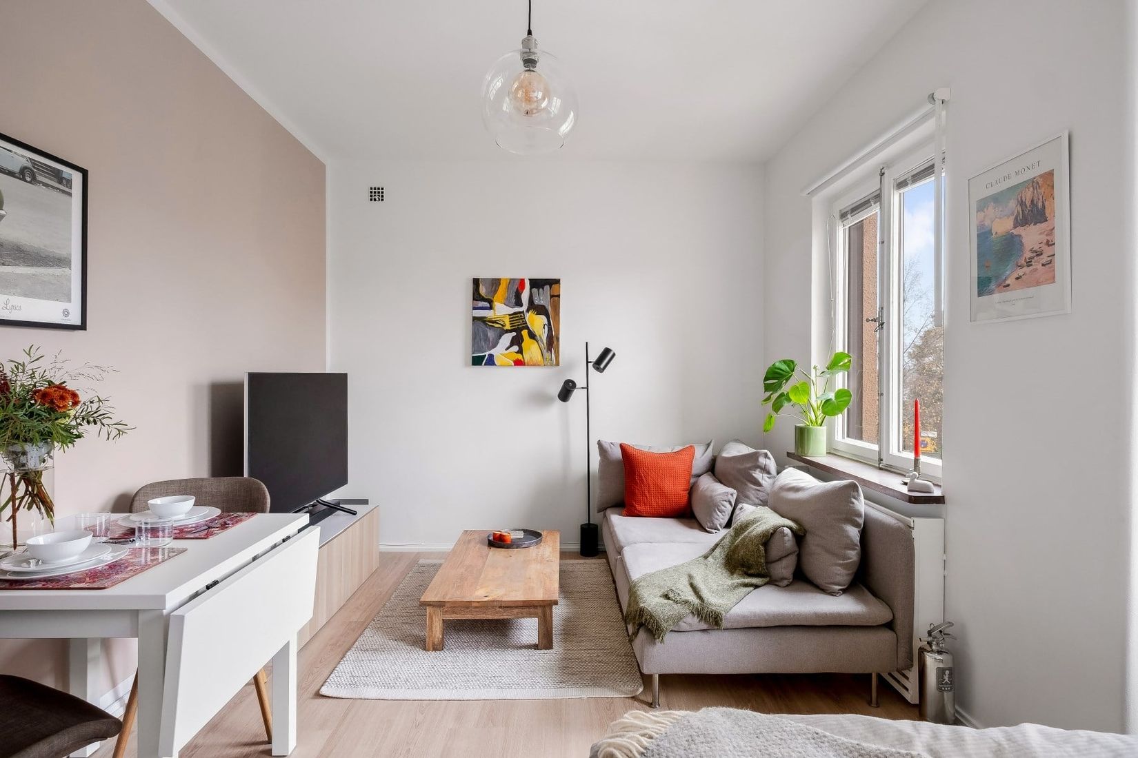 Den genomtänkta planlösningen gör att det finns gott om utrymme för allt man behöver. Här finns till exempel en naturlig del för vardagsrum med plats för både soffa och tv-grupp intill ett härligt västervänt fönster. Rummet kan dessutom enkelt avskiljas för den som önskar, och på så sätt förvandlas bostaden till en smart planerad mini-tvåa. En ordentlig säng, skrivbord och matbord får också plats i det stora allrummet tack vare den välplanerade ytan.