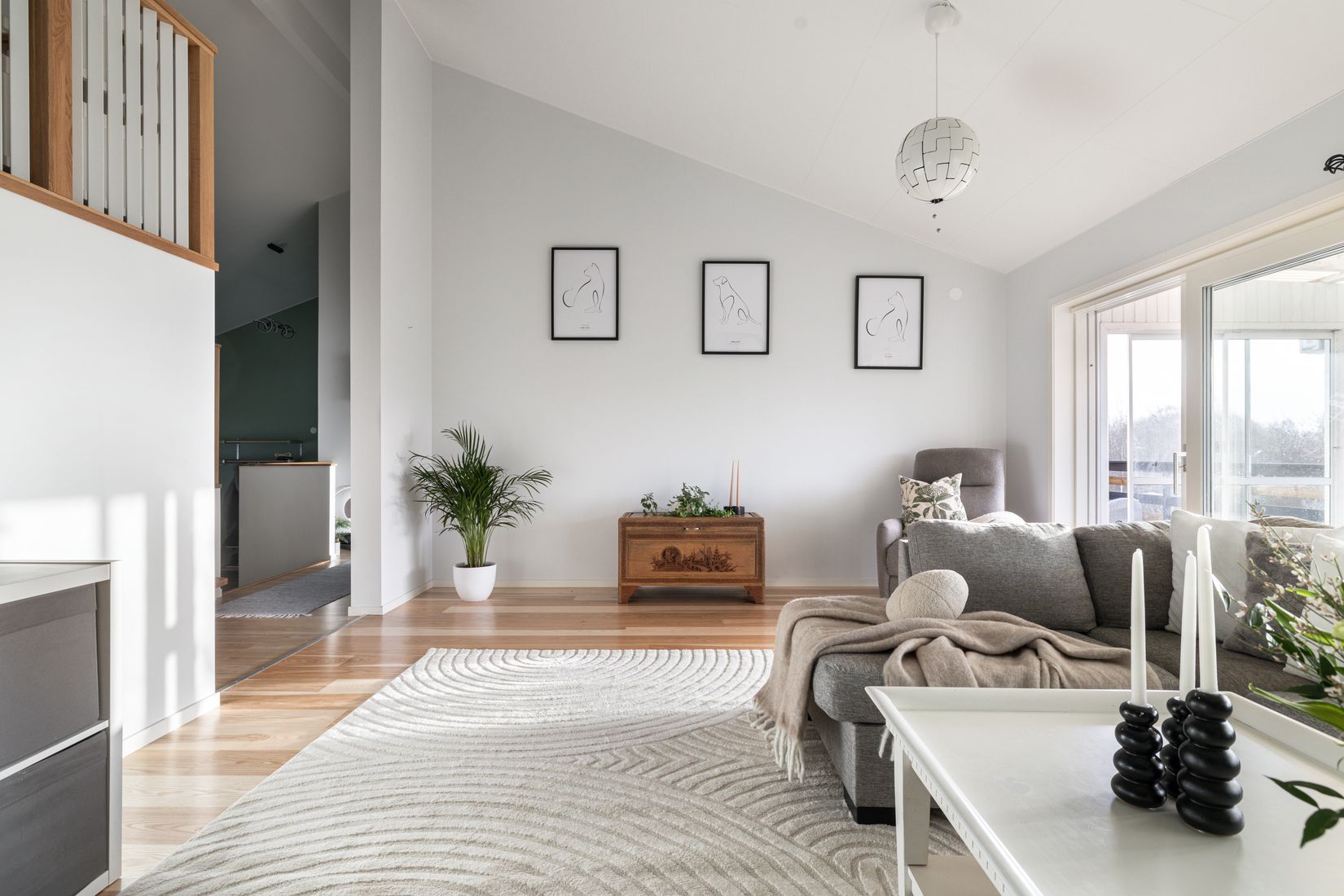 Det trevliga köket med stora fönster och burspråk har ett vackert ljus och rymd. Ljust golv och vita väggar fångar upp den redan ljusa och luftiga känslan. Den mörka bänkskivan är väl tilltagen och ger gott om utrymme för matlagning och bakning med familj och vänner. Klassiskt vita skåpsluckor kombineras med ett marinblått kakel med struktur. Genom såväl över- som underskåp ges underbara förvaringsmöjligheter. Köket är utrustat ned integrerad ugn, mikro, diskmaskin, spishäll, köksfläkt och delad kyl/frys. Rummet ger plats åt ett stort köksbord som rymmer en större middagsbjudning. Via den glasade altandörren tar ni er vidare ut till altanen där eftermiddags- och kvällssolen skiner. Från altanen kan ni direkt till höger ta er in i det trivsamma uterummet. Även här finns utrymme för ett middagsbord eller soffgrupp. Från uterummet finns en dörr direkt in till sällskapsrummet som präglas av fantastisk takhöjd och vita väggar. Sällskapsrummet ger utrymme för en större soffgrupp och förvaringsmöbler samt mediabänk.