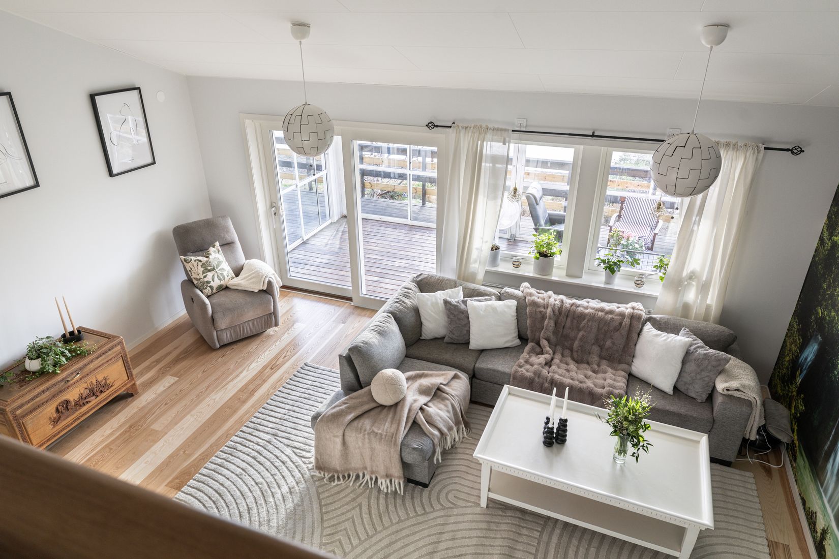 Intill sovrummet finns badrummet som har ett modernt stuk med grafitsvarta kakelplattor på väggarna och vitt klinkergolv. I badrummet finns en vit kommod med förvaring, wc-stol och dusch. Vidare tar ni er via en mindre etagetrappa till bostadens hjärta som är de sociala ytorna. Direkt till vänster finns en klädkammare med ett mindre fönster. Klädkammaren kan nyttjas för förvaring eller varför inte ett mindre kontorsutrymme eller för att hushålla med en gästsäng. Utrymmet är idag inrett med två klädhyllor, ljust golv och ljusgrå färg på väggarna.