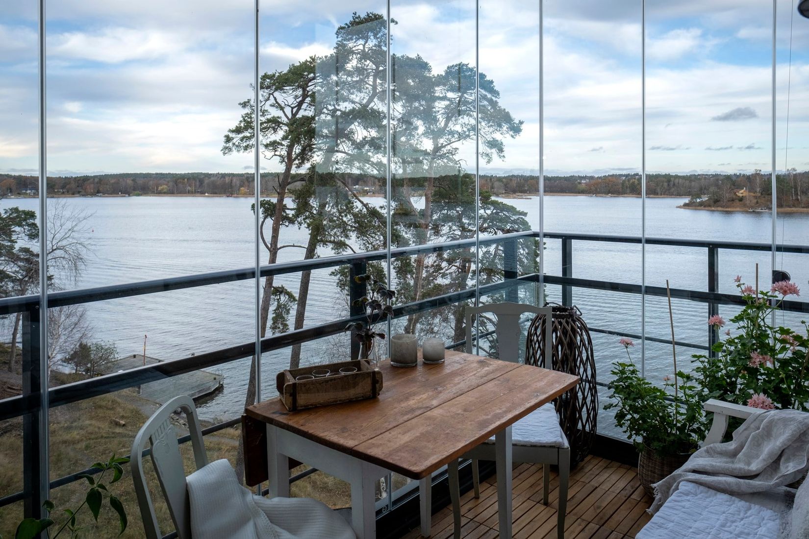 Välkommen till en ljus och välplanerad trea om ca 83 kvm med högt läge och fantastisk sjöutsikt över Norra Vaxholmsfjärden. Här bor du på entréplan i ett suterränghus byggt för endast cirka åtta år sedan, med två balkonger i två olika väderstreck, varav en har utgång från köket och den andra från sovrummet.
