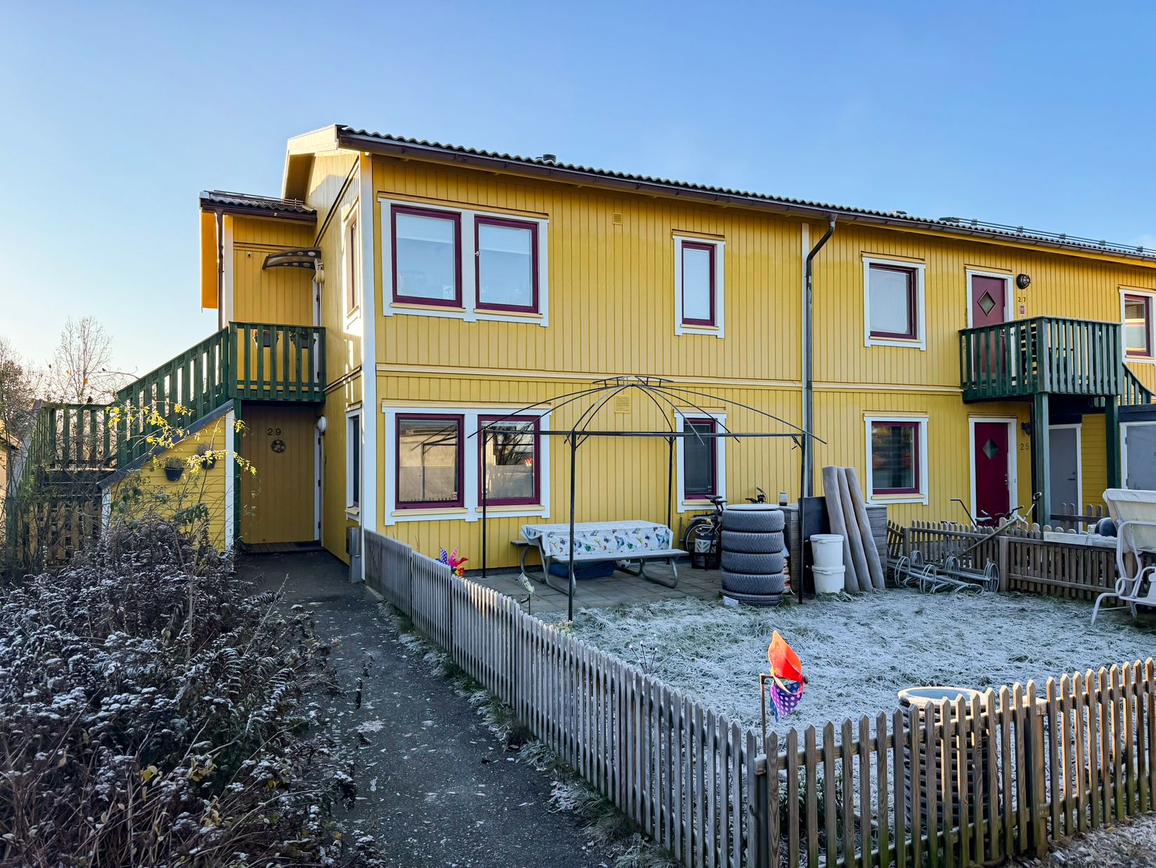 Välkommen till Björclous väg och denna trivsamma gavellägenhet med radhuskänsla. Här bor man bekvämt i markplan med en liten trädgård på husets framsida bestående av en gräsplätt och en stensatt uteplats omgärdad av ett staket. Intill entrén finns ett förråd som hör till bostaden. Entréhallen är rymlig och ljus. Rakt fram finns två garderober samt en riktigt rymlig klädkammare. Köket ligger med fönster mot husets framsida. Här finns kyl och frys i fullhöjd, skafferi, diskmaskin, spis och spisfläkt. I köket ryms en matplats för 4-5 personer. Intill köket ligger badrummet. Här är väggarna kaklade och golvet klätt i ljus våtrumsmatta. Här finns även en rymlig duschkabin samt handfat, spegelskåp, wc och tvättmaskin.