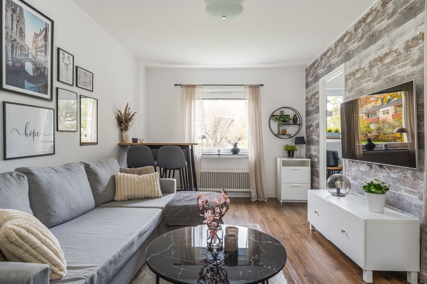 Modernt och kvadrat smart hem med ljusa färger och matchade materialval. Här erbjuds ett vardagsrum med plats för soffa och matplats, sovalkov med utrymme för 1,60 säng och garderob, kokvrå, duschrum samt hall med förvaringsmöjligheter.