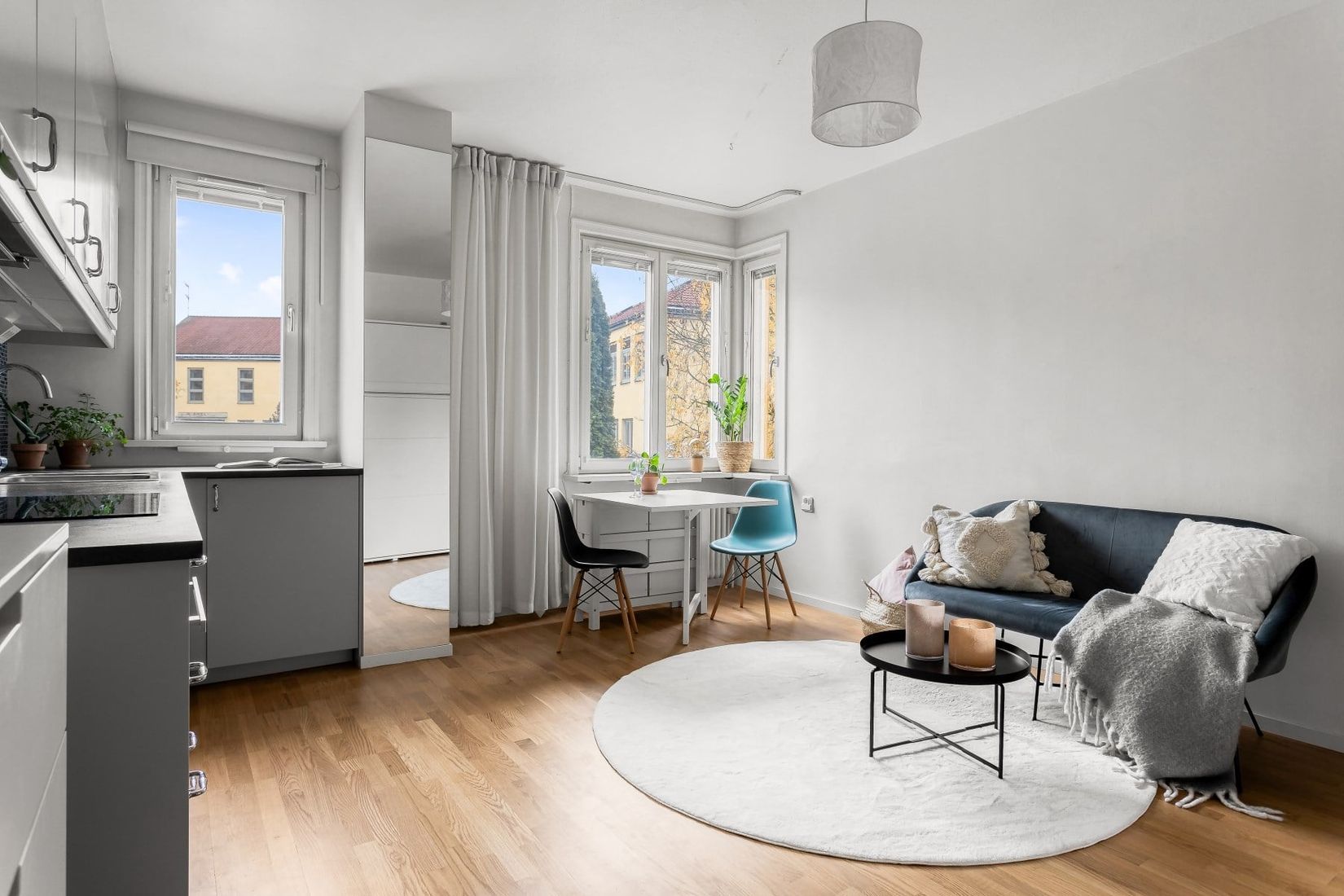 Bostaden präglas av ljusa materialval, smakfulla ytskikt och en genomtänkt planlösning där varje kvadratmeter nyttjas effektivt. Det trivsamma allrummet erbjuder gott om plats för både soffa, matgrupp och sängskåp. Stora fönster i västerläge bjuder på ett fantastiskt ljusinsläpp och en härlig känsla av rymd. Det smakfullt renoverade köket går i trivsamma färger och erbjuder generöst med förvaring och arbetsyta. Här finns all utrustning såsom induktionshäll, kombinerad mikro/ugn, kyl/frys och diskho, allt du behöver för att trivas i vardagen.