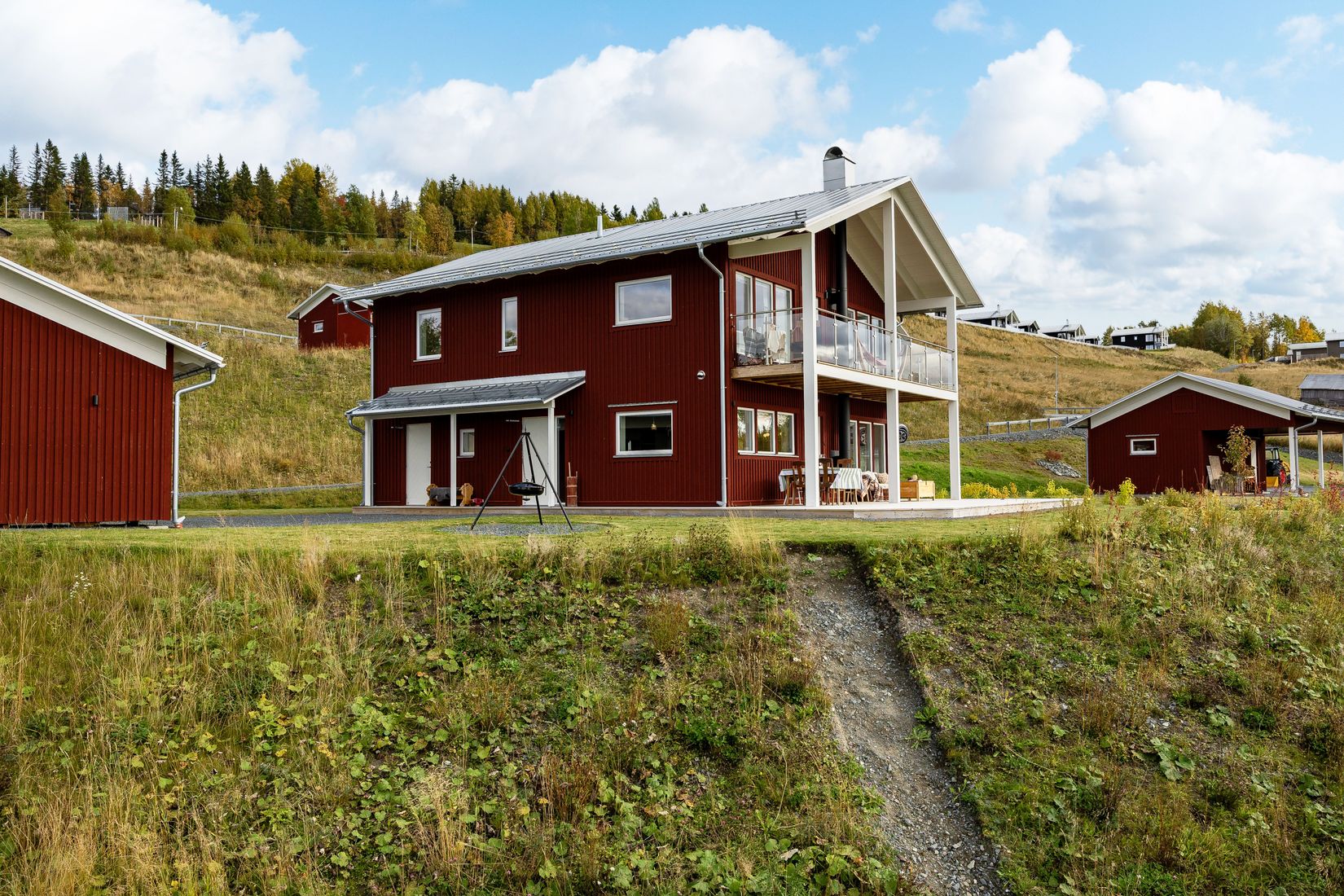 Den utvändiga miljön bjuder på en balkong och altan i sydvästläge, perfekt för att njuta av både utsikt och sol. Beläget i ekobyn Ladriket, som kombinerar ekologiskt boende med kulturhistorisk anknytning, har du tillgång till lekplats precis nedanför huset. Samfälligheter ger delägande i vägar och fritidsanläggningar, där padelbanor, utegym och grillplats finns tillgängliga. Skidriket på toppen med elljusspår (längd på vintern), vallabod och gemensam samkvämslokal med bakstuga vedeldad och microbryggeri. Aktiv bygdegård. Skidspår och skoterleder är lättillgängliga.