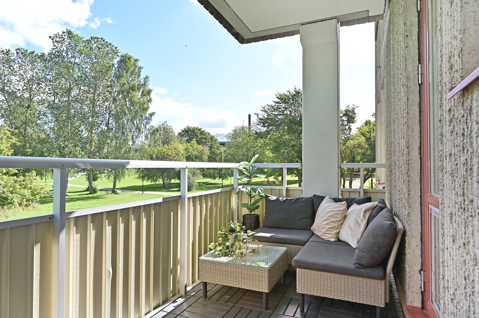 Köket är både praktiskt och inbjudande med ljusa ytskikt, bra arbetsytor och maskinell utrustning som gör vardagen smidig. Från köket tar du dig rakt ut på balkongen som vetter mot söder och bjuder på sol större delen av dagen. Utsikten är fri, känslan är privat och lugnet är påtagligt.