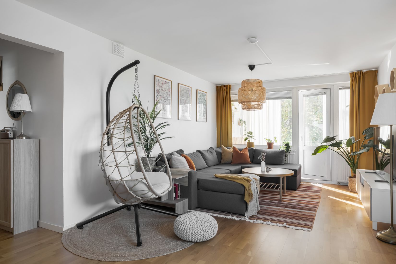 Den generösa planlösningen om 101,5 kvm fördelar sig på fem rum och kök, med ljusinsläpp från tre väderstreck och ett härligt flöde genom hela bostaden. Lägenheten ligger på andra våningen och har en perfekt kombination av rymd, ljus och trivsel. Den inglasade balkongen vetter mot föreningens grönskande bakgård och bjuder på sol stora delar av dagen.
