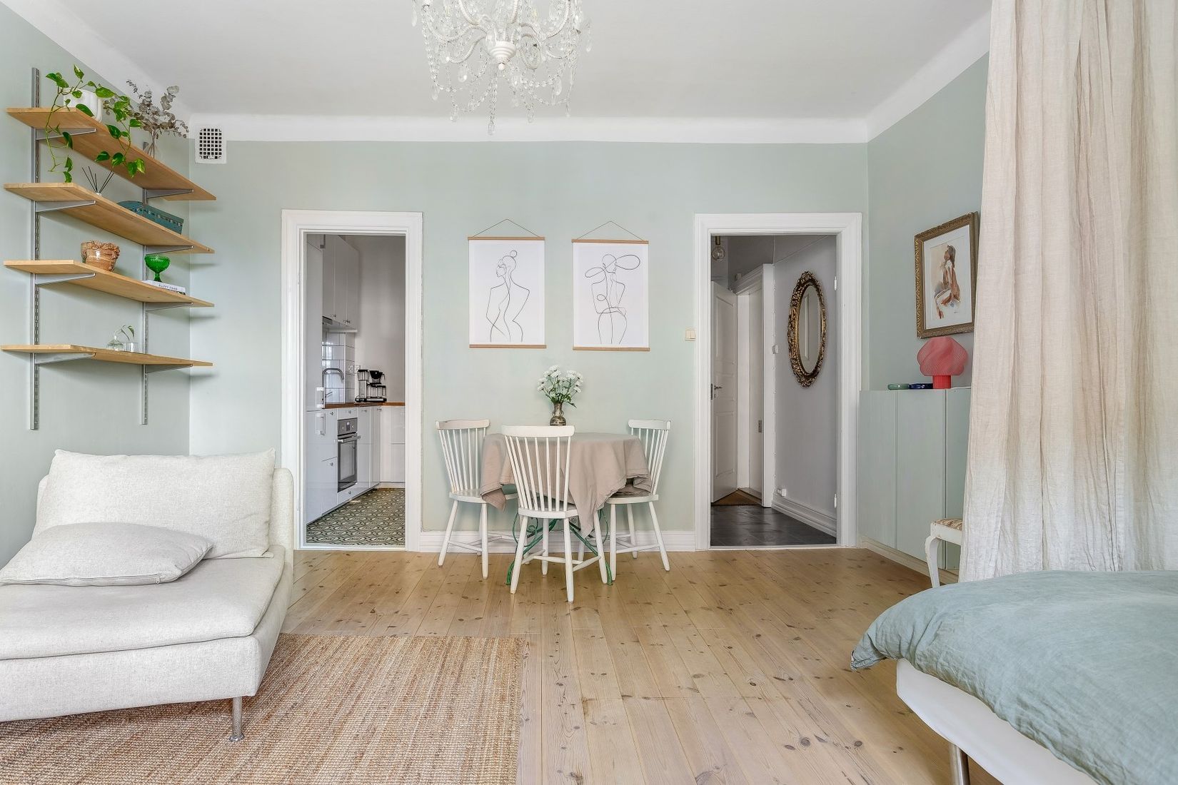 Vidare in i allrummet möts du av ett fantastiskt ljusinsläpp från det stora spröjsade fönstret. Den generösa takhöjden, trägolven, de vackra originaldörrarna och listerna samt den charmiga snedväggen skapar en genuin sekelskiftesatmosfär som är svår att motstå. Rummet är lättmöblerat och erbjuder gott om plats för både säng, soffa och matbord!