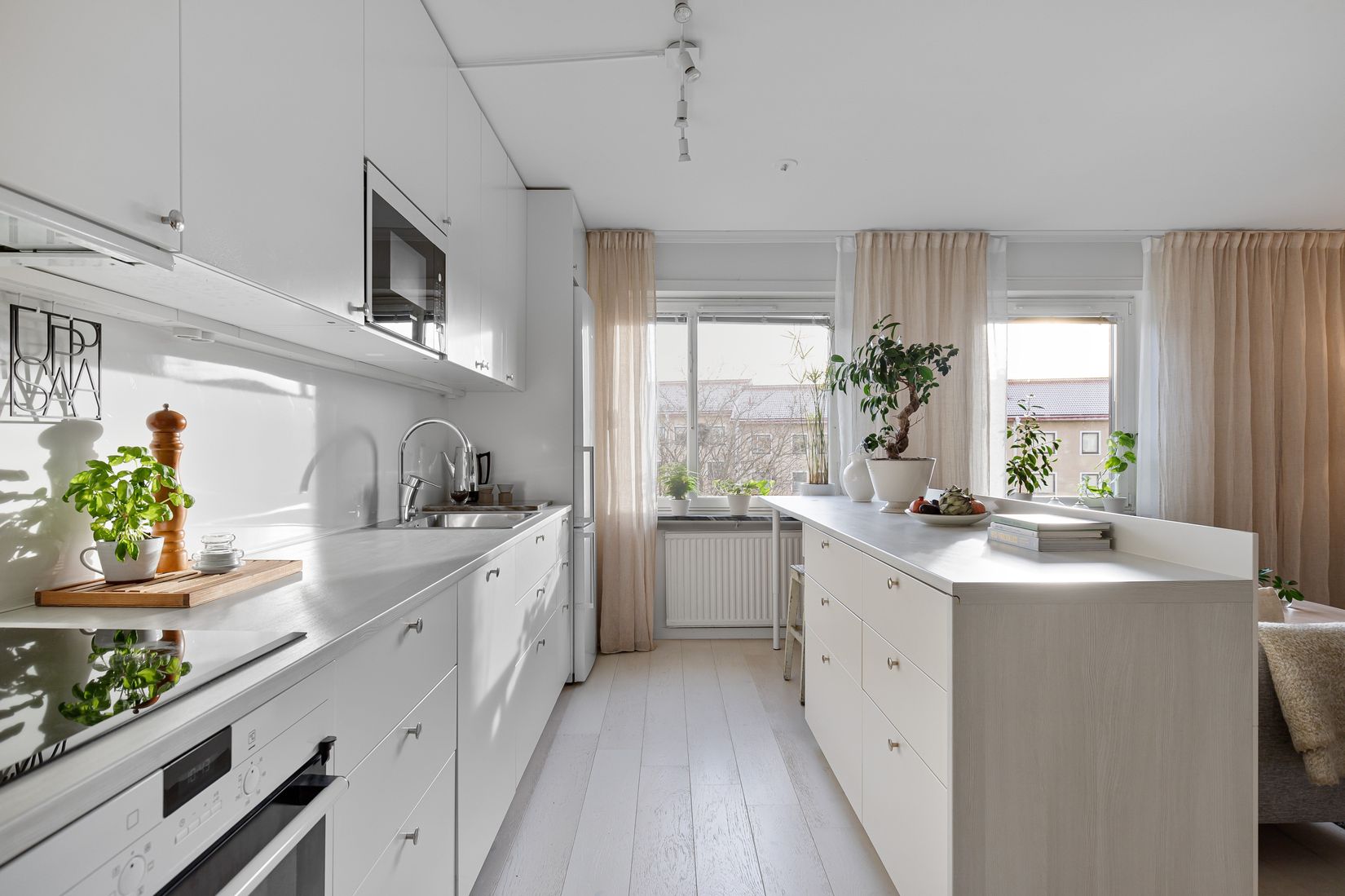 Innanför entrédörren möts du av en entré med plats för avhängning i garderob. Vidare öppnar bostaden upp sig i en social och luftig planlösning där kök, matplats och vardagsrum samspelar på ett naturligt sätt. Det moderna köket är utrustat med diskmaskin och en praktisk köksö som bidrar med både extra arbetsyta och förvaring, vilket är perfekt för vardagens bestyr eller festliga middagsförberedelser. Vardagsrumsdelen erbjuder gott om plats för en mysig TV-hörna. Här erbjuds ett mindre sovrum, med fönster mot innergården, som lämpar sig utmärkt som barnrum, gästrum eller hemmakontor och som rymmer förvaring i en dubbelgarderob. Det större sovrummet har gott om plats för dubbelsäng och har direkt utgång till bostadens balkong med utsikt mot parken. Här finns även en rymlig klädkammare som bidrar med utmärkt förvaring. Det kaklade badrummet är utrustat med duschvägg, kommod, spegelskåp med belysning samt tvättmaskin som förenklar vardagen ytterligare. Till lägenheten finns två förråd att nyttja, varav ett matkällarförråd.