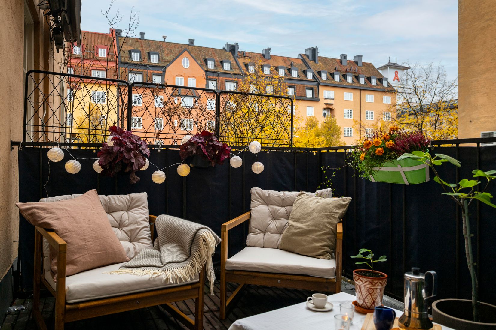 Från vardagsrummet nås den härliga terrass liknande balkongen, en riktig oas från april till oktober – perfekt för morgonkaffet, middagar med vänner eller en stund i solen.