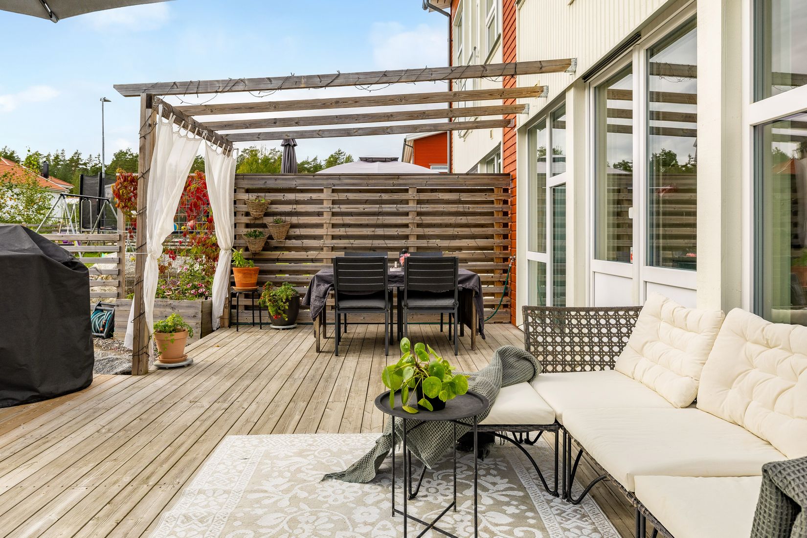 Entrévåningen bjuder på ett modernt kök och matplats med pardörrar som leder ut till den utbyggda altanen. Här kan du njuta av många soltimmar i söderläge och utsikt över tomten. Utanför staketet är det en allmänning.