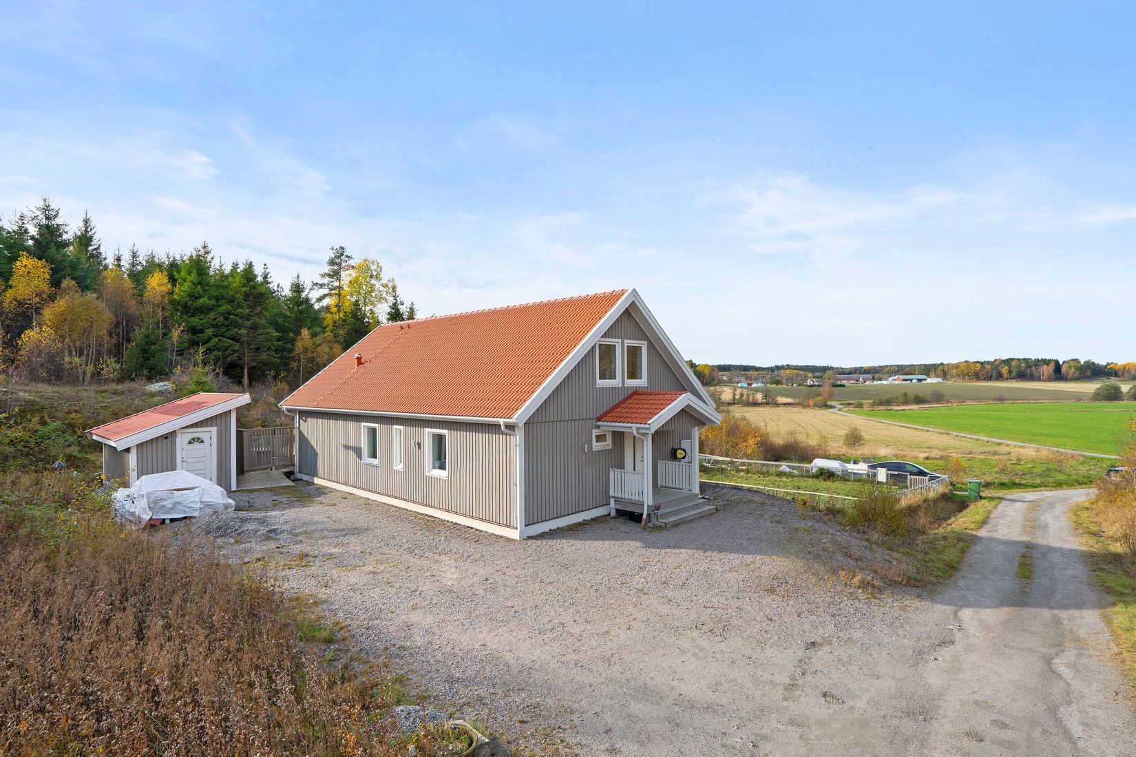På entréplan välkomnas du av en generös hall med skjutdörrsgarderober och gott om förvaring. Det stora vardagsrummet bjuder in till sociala stunder med plats för både soffgrupp och matbord, och de stora fönstren ramar in den rofyllda utsikten över åkrarna. Härifrån nås även den rymliga altanen, perfekt för grillkvällar och soliga sommardagar. Köket är ljust, välplanerat och fullt utrustat med vitvaror som induktionshäll, diskmaskin, ugn, mikro, kyl och frys, samt gott om arbetsyta och förvaring. Entréplanet rymmer även två sovrum, varav ett med egen walk-in-closet och tillhörande badrum. Dessutom finns en separat tvättstuga samt ett badrum med dusch och bra förvaringsmöjligheter i förråd.
